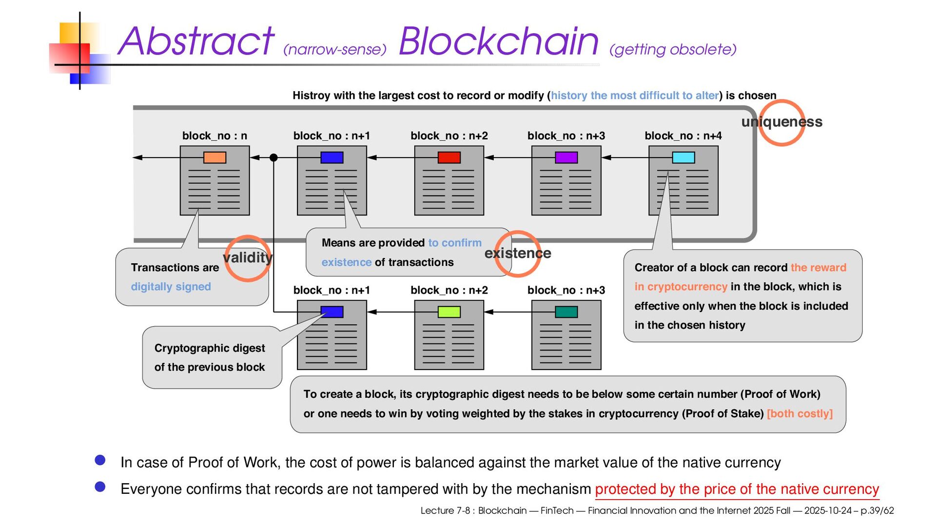 n+1 block_no : n+2 block_no : n+3 block_no : n+1 block_no : n+2 block_no : n+3 block_no : n+4 Histroy with the largest cost to record or modify (history the most difficult to alter) is chosen Cryptographic digest of the previous block Transactions are digitally signed To create a block, its cryptographic digest needs to be below some certain number (Proof of Work) or one needs to win by voting weighted by the stakes in cryptocurrency (Proof of Stake) [both costly] Creator of a block can record the reward in cryptocurrency in the block, which is effective only when the block is included in the chosen history Means are provided to confirm existence of transactions validity existence uniqueness In case of Proof of Work, the cost of power is balanced against the market value of the native currency Everyone confirms that records are not tampered with by the mechanism protected by the price of the native currency Lecture 7-8 : Blockchain — FinTech — Financial Innovation and the Internet 2025 Fall — 2025-10-24 – p.39/62