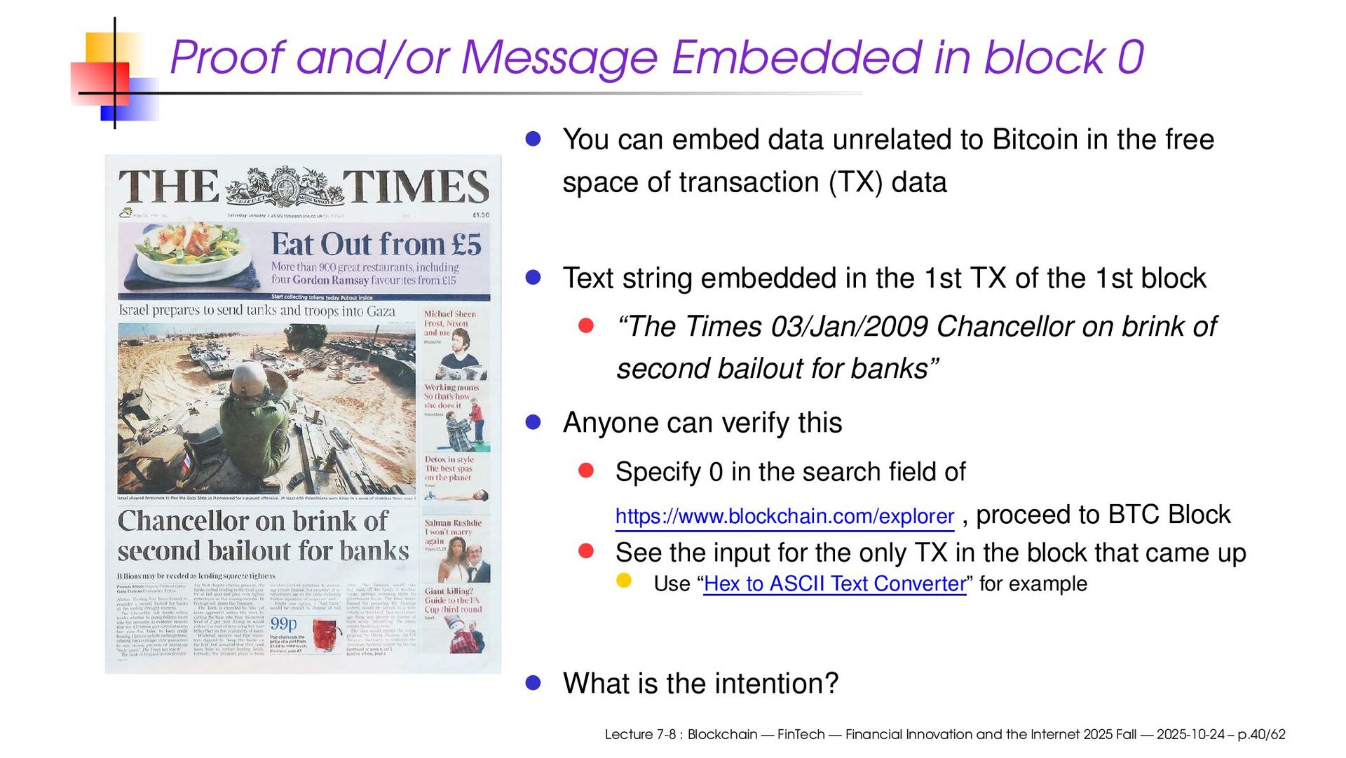data unrelated to Bitcoin in the free space of transaction (TX) data Text string embedded in the 1st TX of the 1st block “The Times 03/Jan/2009 Chancellor on brink of second bailout for banks” Anyone can verify this Specify 0 in the search field of https://www.blockchain.com/explorer , proceed to BTC Block See the input for the only TX in the block that came up Use “Hex to ASCII Text Converter” for example What is the intention? Lecture 7-8 : Blockchain — FinTech — Financial Innovation and the Internet 2025 Fall — 2025-10-24 – p.40/62