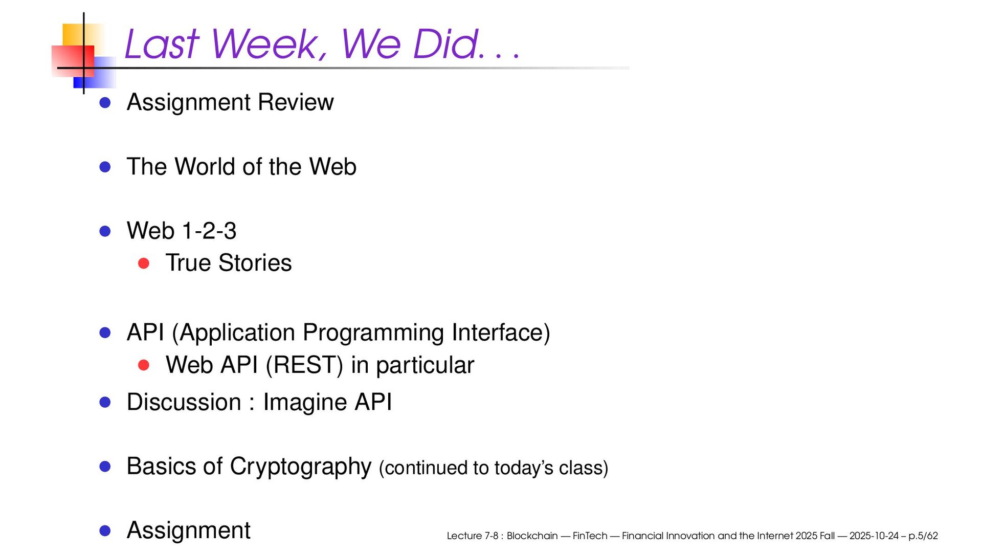 World of the Web Web 1-2-3 True Stories API (Application Programming Interface) Web API (REST) in particular Discussion : Imagine API Basics of Cryptography (continued to today’s class) Assignment Lecture 7-8 : Blockchain — FinTech — Financial Innovation and the Internet 2025 Fall — 2025-10-24 – p.5/62