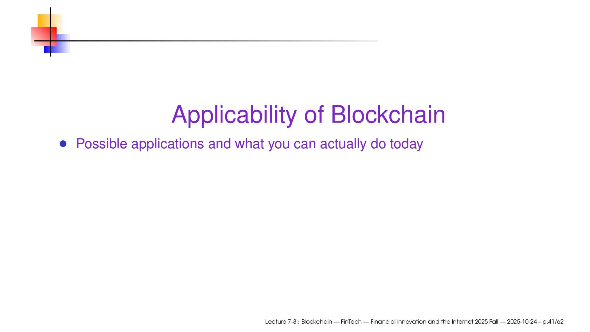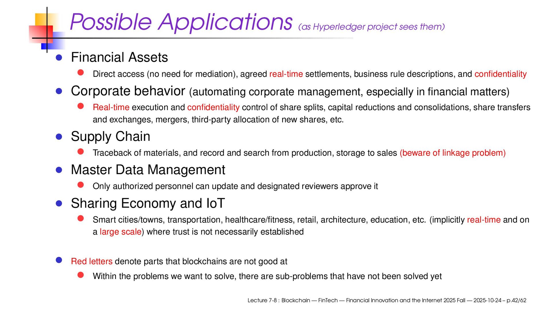 access (no need for mediation), agreed real-time settlements, business rule descriptions, and confidentiality Corporate behavior (automating corporate management, especially in financial matters) Real-time execution and confidentiality control of share splits, capital reductions and consolidations, share transfers and exchanges, mergers, third-party allocation of new shares, etc. Supply Chain Traceback of materials, and record and search from production, storage to sales (beware of linkage problem) Master Data Management Only authorized personnel can update and designated reviewers approve it Sharing Economy and IoT Smart cities/towns, transportation, healthcare/fitness, retail, architecture, education, etc. (implicitly real-time and on a large scale) where trust is not necessarily established Red letters denote parts that blockchains are not good at Within the problems we want to solve, there are sub-problems that have not been solved yet Lecture 7-8 : Blockchain — FinTech — Financial Innovation and the Internet 2025 Fall — 2025-10-24 – p.42/62