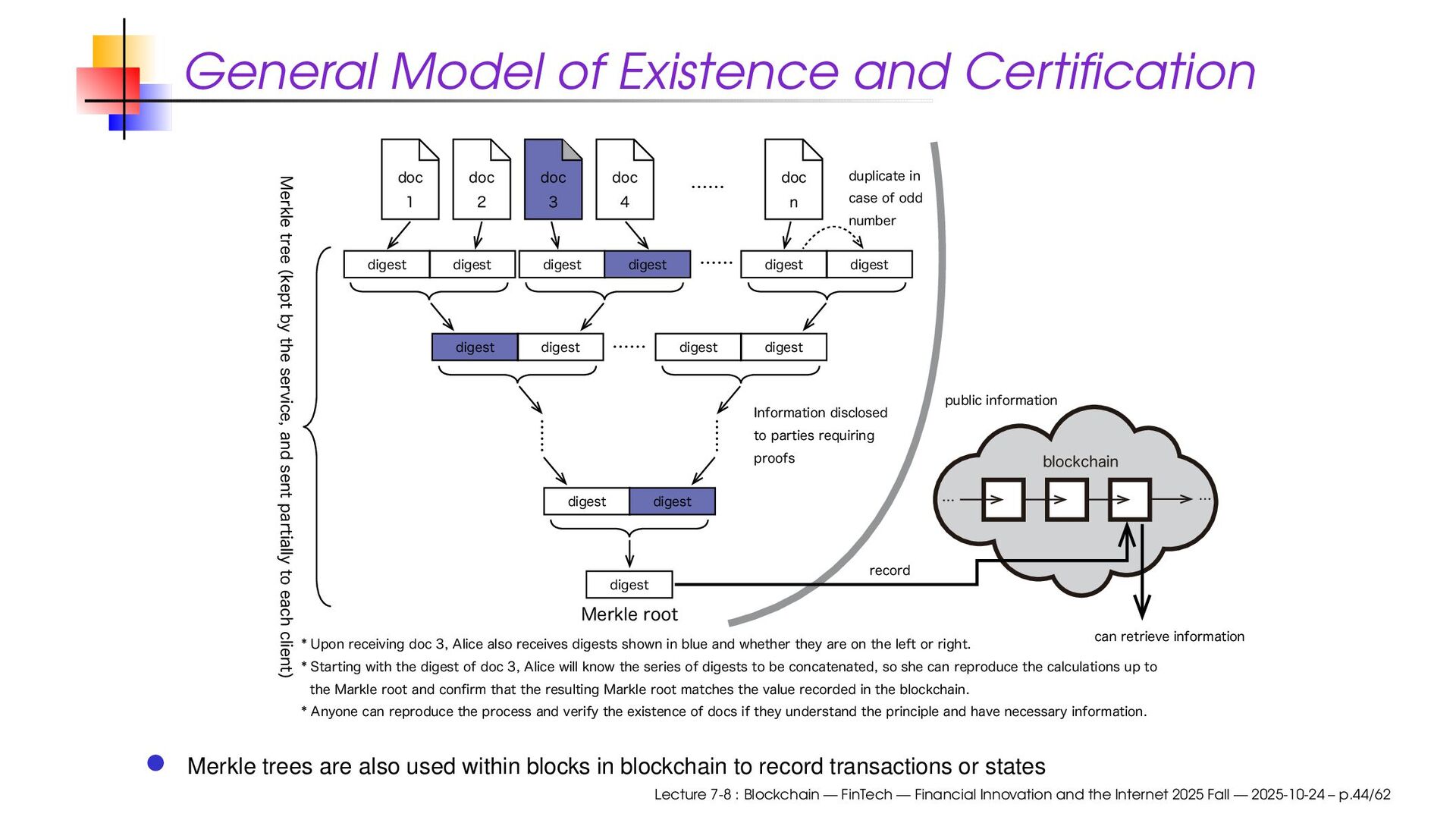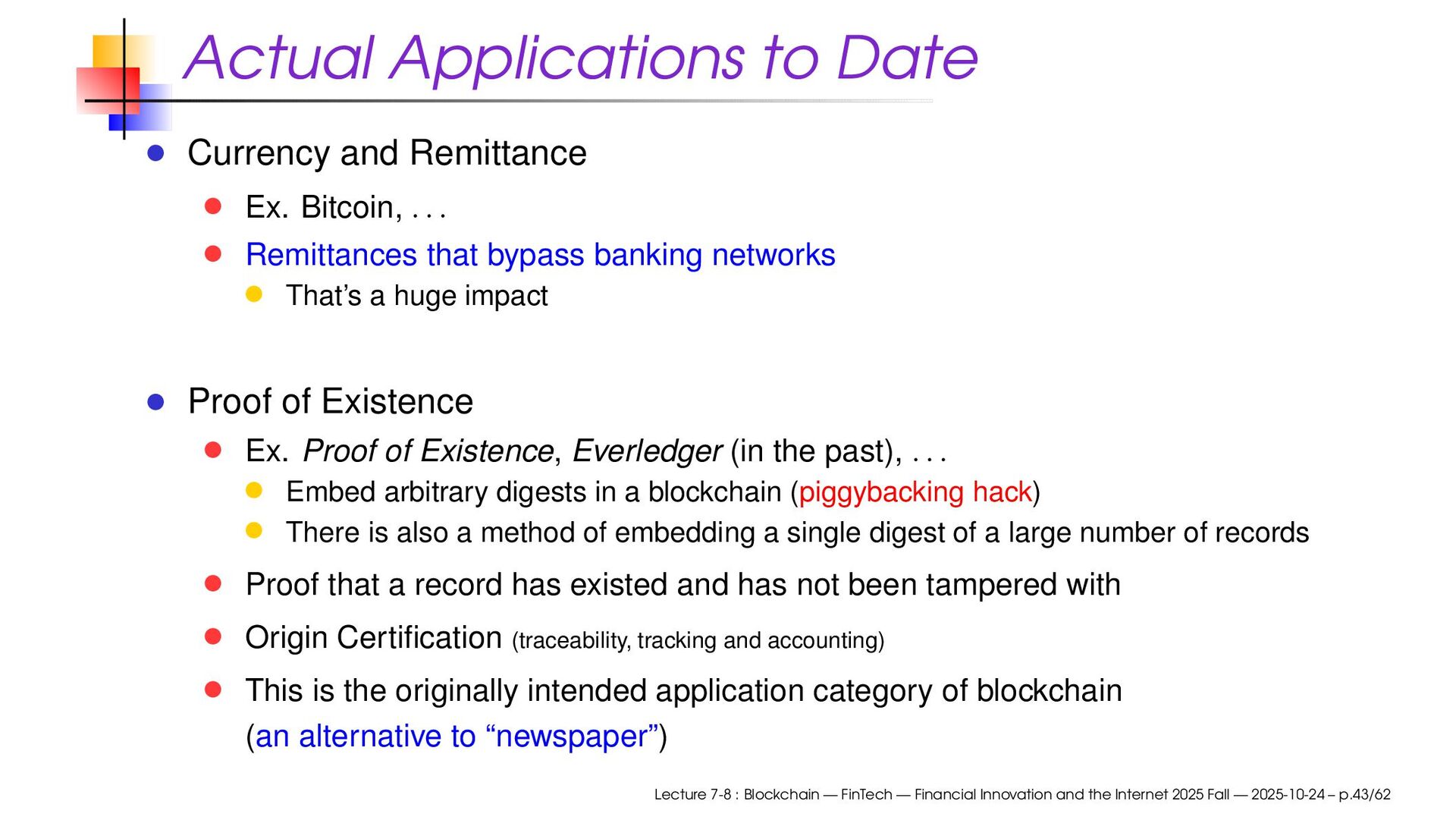 . . Remittances that bypass banking networks That’s a huge impact Proof of Existence Ex. Proof of Existence, Everledger (in the past), . . . Embed arbitrary digests in a blockchain (piggybacking hack) There is also a method of embedding a single digest of a large number of records Proof that a record has existed and has not been tampered with Origin Certification (traceability, tracking and accounting) This is the originally intended application category of blockchain (an alternative to “newspaper”) Lecture 7-8 : Blockchain — FinTech — Financial Innovation and the Internet 2025 Fall — 2025-10-24 – p.43/62
