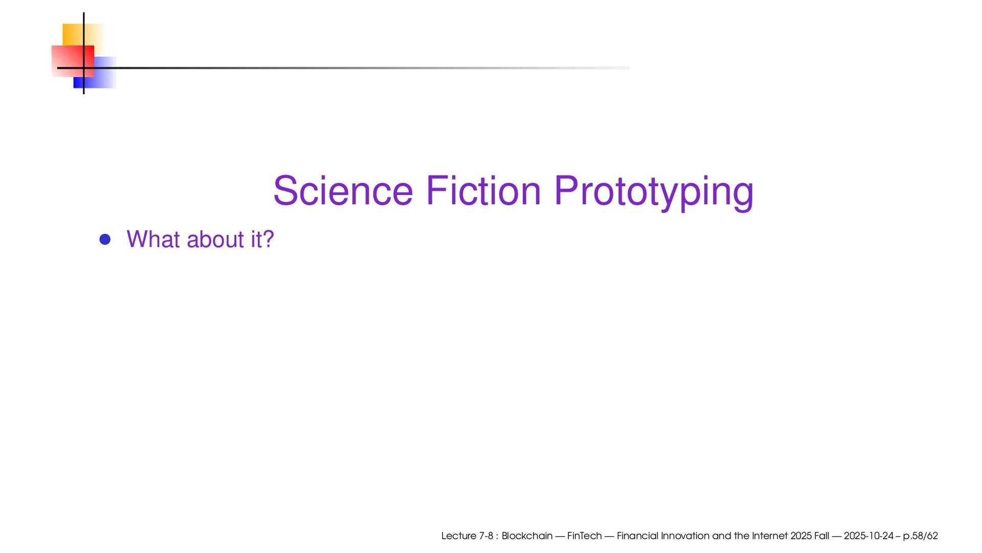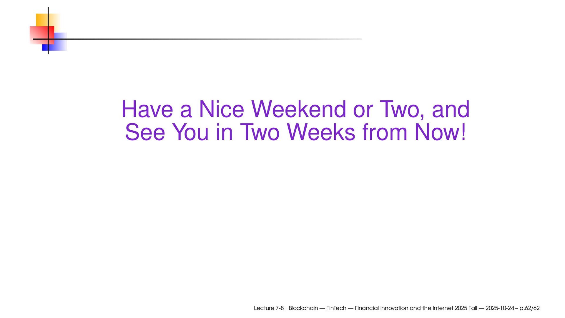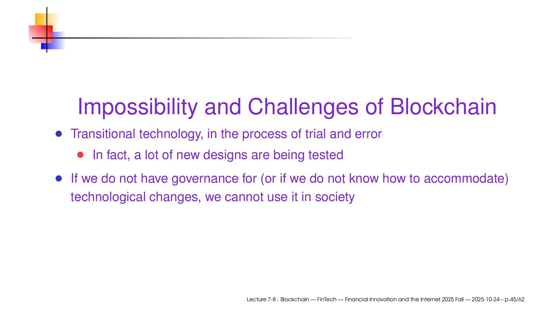 of trial and error In fact, a lot of new designs are being tested If we do not have governance for (or if we do not know how to accommodate) technological changes, we cannot use it in society Lecture 7-8 : Blockchain — FinTech — Financial Innovation and the Internet 2025 Fall — 2025-10-24 – p.45/62