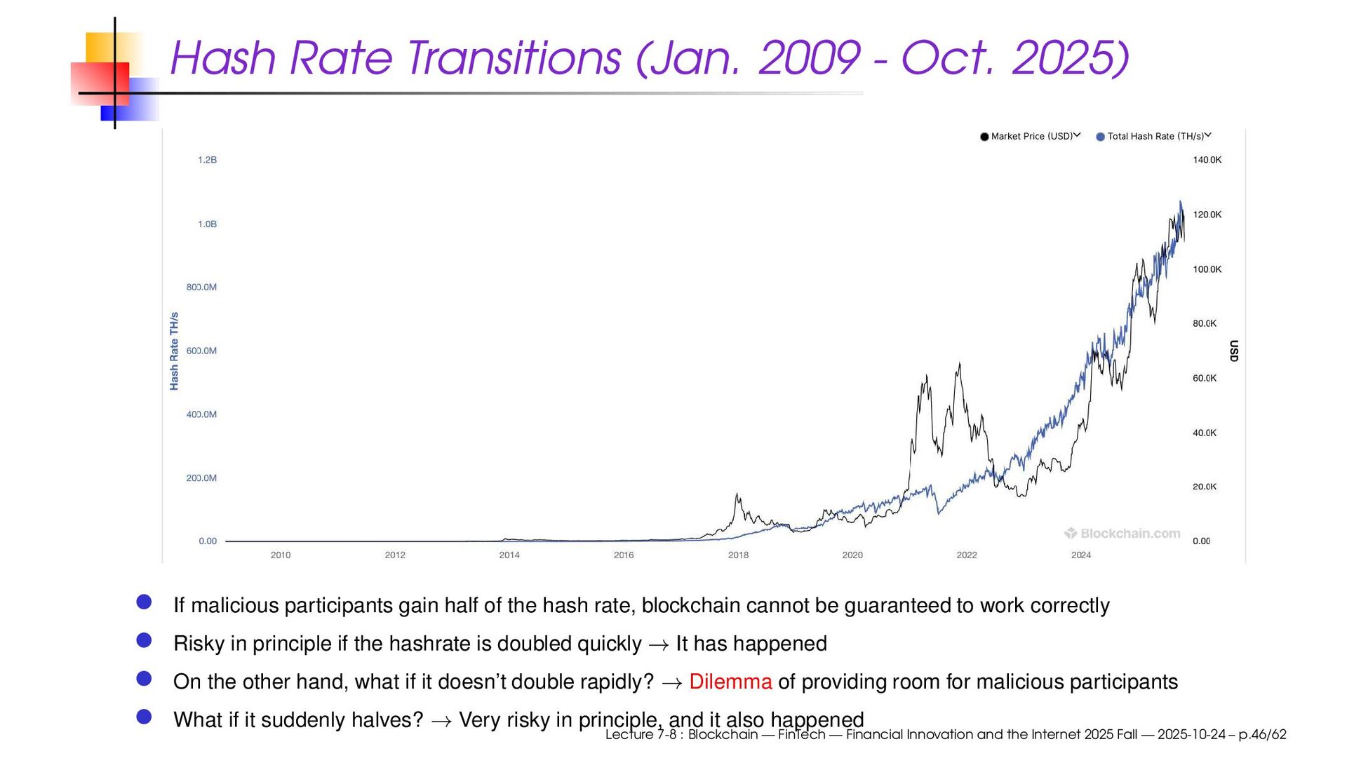 participants gain half of the hash rate, blockchain cannot be guaranteed to work correctly Risky in principle if the hashrate is doubled quickly → It has happened On the other hand, what if it doesn’t double rapidly? → Dilemma of providing room for malicious participants What if it suddenly halves? → Very risky in principle, and it also happened Lecture 7-8 : Blockchain — FinTech — Financial Innovation and the Internet 2025 Fall — 2025-10-24 – p.46/62