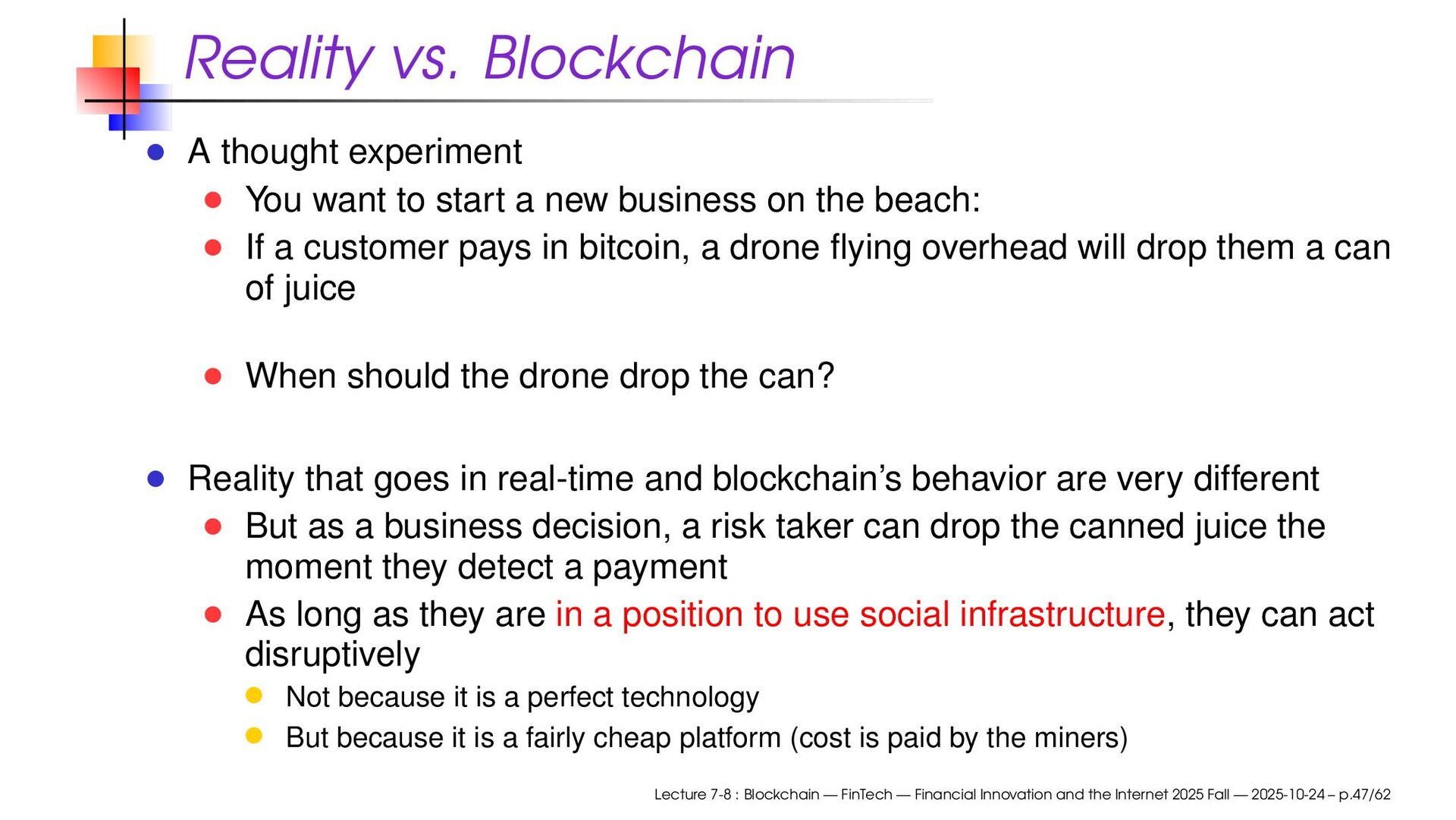 a new business on the beach: If a customer pays in bitcoin, a drone flying overhead will drop them a can of juice When should the drone drop the can? Reality that goes in real-time and blockchain’s behavior are very different But as a business decision, a risk taker can drop the canned juice the moment they detect a payment As long as they are in a position to use social infrastructure, they can act disruptively Not because it is a perfect technology But because it is a fairly cheap platform (cost is paid by the miners) Lecture 7-8 : Blockchain — FinTech — Financial Innovation and the Internet 2025 Fall — 2025-10-24 – p.47/62