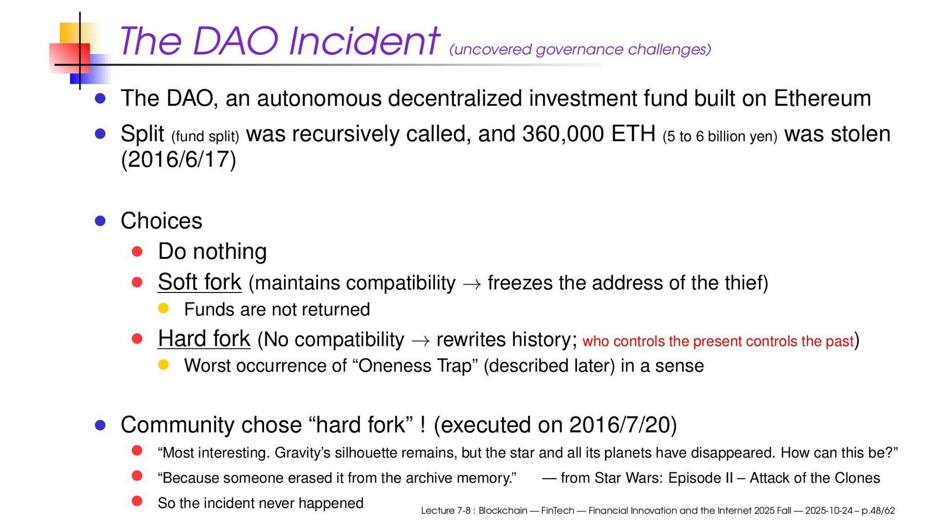 decentralized investment fund built on Ethereum Split (fund split) was recursively called, and 360,000 ETH (5 to 6 billion yen) was stolen (2016/6/17) Choices Do nothing Soft fork (maintains compatibility → freezes the address of the thief) Funds are not returned Hard fork (No compatibility → rewrites history; who controls the present controls the past) Worst occurrence of “Oneness Trap” (described later) in a sense Community chose “hard fork” ! (executed on 2016/7/20) “Most interesting. Gravity’s silhouette remains, but the star and all its planets have disappeared. How can this be?” “Because someone erased it from the archive memory.” — from Star Wars: Episode II – Attack of the Clones So the incident never happened Lecture 7-8 : Blockchain — FinTech — Financial Innovation and the Internet 2025 Fall — 2025-10-24 – p.48/62