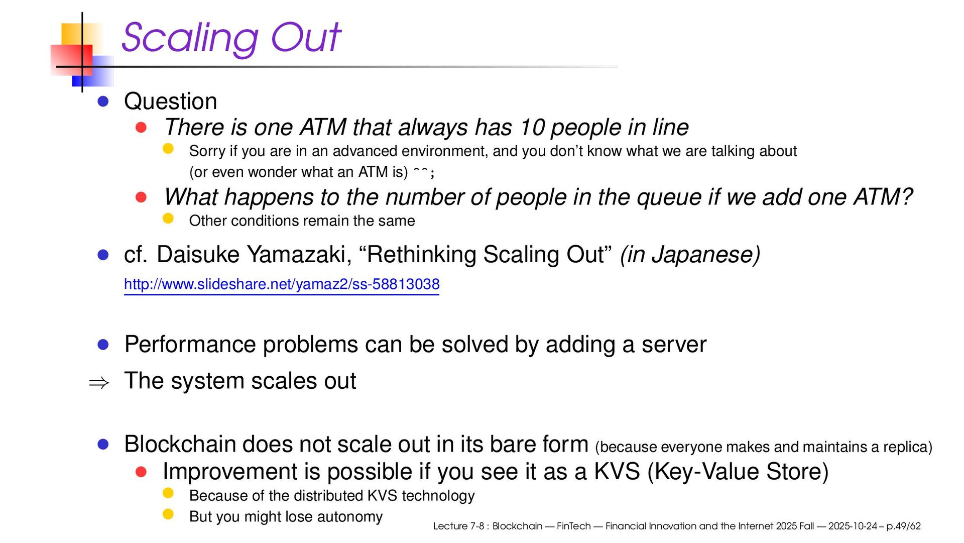 10 people in line Sorry if you are in an advanced environment, and you don’t know what we are talking about (or even wonder what an ATM is) ^^; What happens to the number of people in the queue if we add one ATM? Other conditions remain the same cf. Daisuke Yamazaki, “Rethinking Scaling Out” (in Japanese) http://www.slideshare.net/yamaz2/ss-58813038 Performance problems can be solved by adding a server ⇒ The system scales out Blockchain does not scale out in its bare form (because everyone makes and maintains a replica) Improvement is possible if you see it as a KVS (Key-Value Store) Because of the distributed KVS technology But you might lose autonomy Lecture 7-8 : Blockchain — FinTech — Financial Innovation and the Internet 2025 Fall — 2025-10-24 – p.49/62