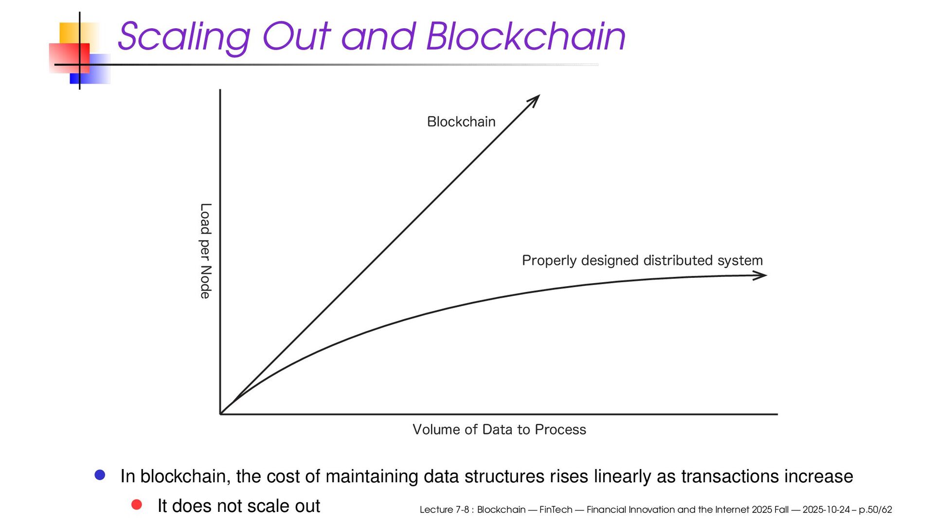 the cost of maintaining data structures rises linearly as transactions increase It does not scale out Lecture 7-8 : Blockchain — FinTech — Financial Innovation and the Internet 2025 Fall — 2025-10-24 – p.50/62