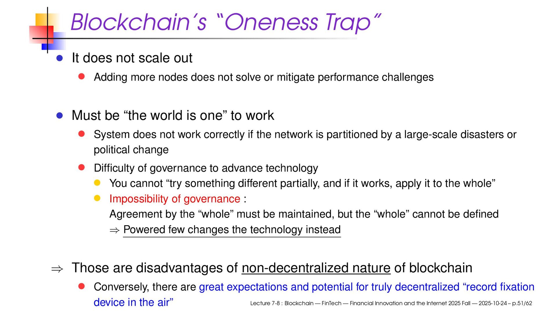 nodes does not solve or mitigate performance challenges Must be “the world is one” to work System does not work correctly if the network is partitioned by a large-scale disasters or political change Difficulty of governance to advance technology You cannot “try something different partially, and if it works, apply it to the whole” Impossibility of governance : Agreement by the “whole” must be maintained, but the “whole” cannot be defined ⇒ Powered few changes the technology instead ⇒ Those are disadvantages of non-decentralized nature of blockchain Conversely, there are great expectations and potential for truly decentralized “record fixation device in the air” Lecture 7-8 : Blockchain — FinTech — Financial Innovation and the Internet 2025 Fall — 2025-10-24 – p.51/62
