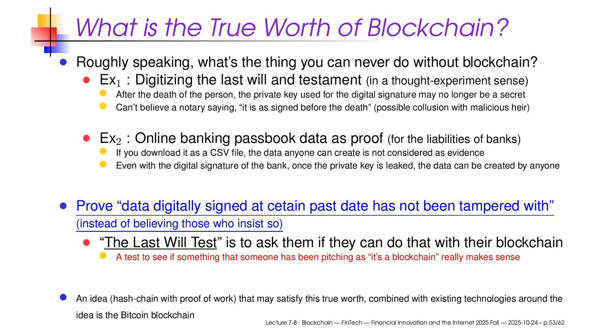 the thing you can never do without blockchain? Ex1 : Digitizing the last will and testament (in a thought-experiment sense) After the death of the person, the private key used for the digital signature may no longer be a secret Can’t believe a notary saying, “it is as signed before the death” (possible collusion with malicious heir) Ex2 : Online banking passbook data as proof (for the liabilities of banks) If you download it as a CSV file, the data anyone can create is not considered as evidence Even with the digital signature of the bank, once the private key is leaked, the data can be created by anyone Prove “data digitally signed at cetain past date has not been tampered with” (instead of believing those who insist so) “The Last Will Test” is to ask them if they can do that with their blockchain A test to see if something that someone has been pitching as “it’s a blockchain” really makes sense An idea (hash-chain with proof of work) that may satisfy this true worth, combined with existing technologies around the idea is the Bitcoin blockchain Lecture 7-8 : Blockchain — FinTech — Financial Innovation and the Internet 2025 Fall — 2025-10-24 – p.53/62