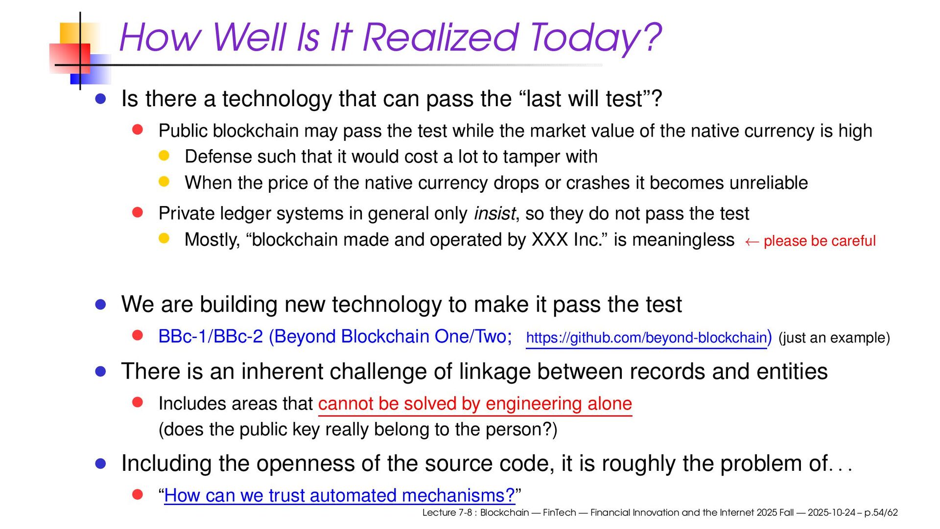 that can pass the “last will test”? Public blockchain may pass the test while the market value of the native currency is high Defense such that it would cost a lot to tamper with When the price of the native currency drops or crashes it becomes unreliable Private ledger systems in general only insist, so they do not pass the test Mostly, “blockchain made and operated by XXX Inc.” is meaningless ← please be careful We are building new technology to make it pass the test BBc-1/BBc-2 (Beyond Blockchain One/Two; https://github.com/beyond-blockchain) (just an example) There is an inherent challenge of linkage between records and entities Includes areas that cannot be solved by engineering alone (does the public key really belong to the person?) Including the openness of the source code, it is roughly the problem of . . . “How can we trust automated mechanisms?” Lecture 7-8 : Blockchain — FinTech — Financial Innovation and the Internet 2025 Fall — 2025-10-24 – p.54/62