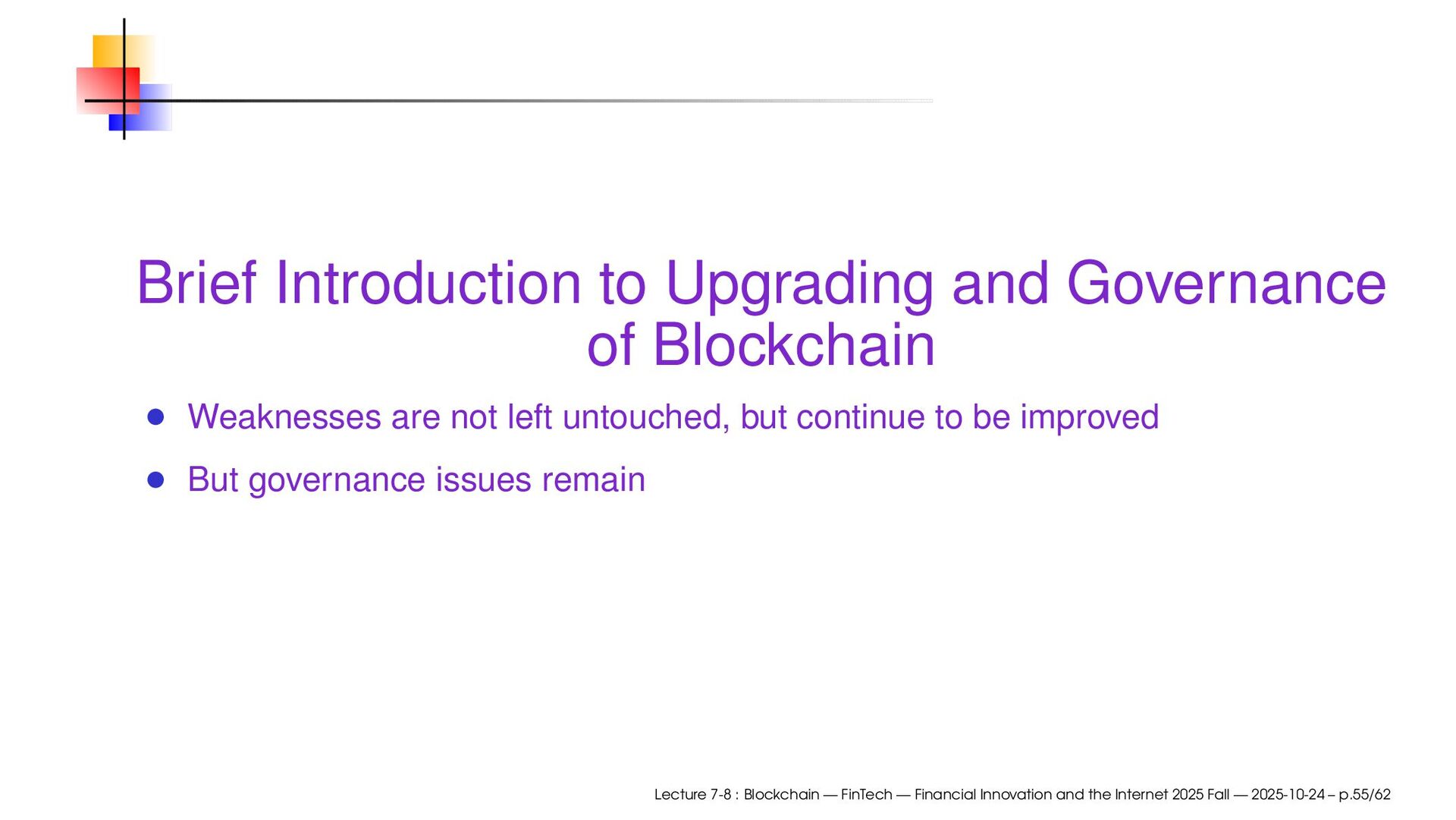 not left untouched, but continue to be improved But governance issues remain Lecture 7-8 : Blockchain — FinTech — Financial Innovation and the Internet 2025 Fall — 2025-10-24 – p.55/62