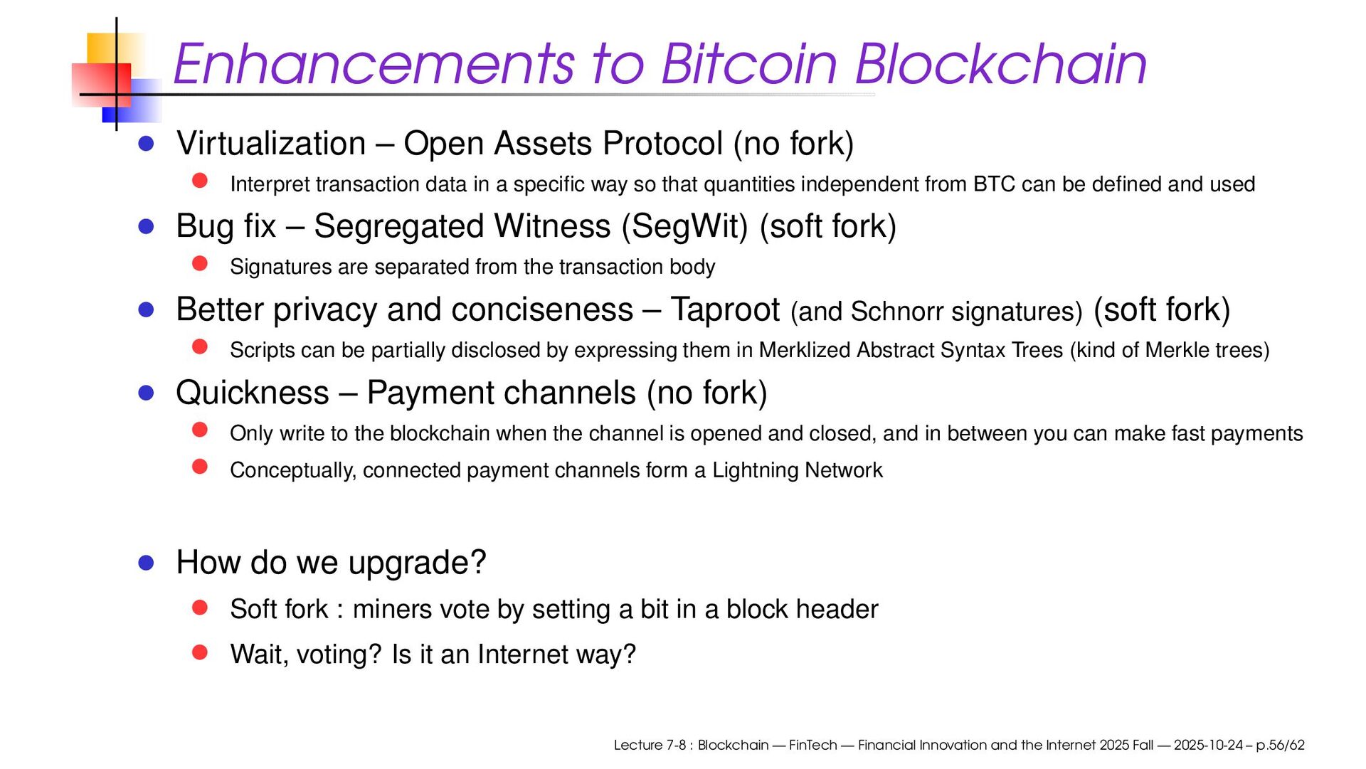 fork) Interpret transaction data in a specific way so that quantities independent from BTC can be defined and used Bug fix – Segregated Witness (SegWit) (soft fork) Signatures are separated from the transaction body Better privacy and conciseness – Taproot (and Schnorr signatures) (soft fork) Scripts can be partially disclosed by expressing them in Merklized Abstract Syntax Trees (kind of Merkle trees) Quickness – Payment channels (no fork) Only write to the blockchain when the channel is opened and closed, and in between you can make fast payments Conceptually, connected payment channels form a Lightning Network How do we upgrade? Soft fork : miners vote by setting a bit in a block header Wait, voting? Is it an Internet way? Lecture 7-8 : Blockchain — FinTech — Financial Innovation and the Internet 2025 Fall — 2025-10-24 – p.56/62