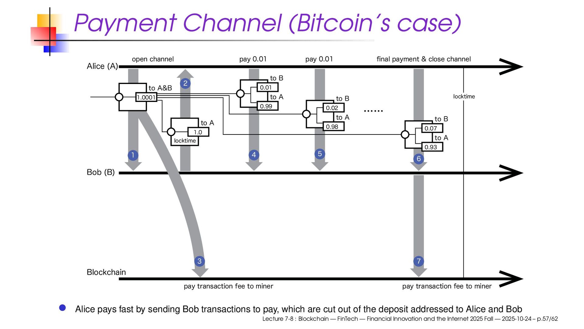 UP"# UP# UP" UP" MPDLUJNF QBZUSBOTBDUJPOGFFUPNJOFS PQFODIBOOFM pOBMQBZNFOUDMPTFDIBOOFM QBZ QBZ QBZUSBOTBDUJPOGFFUPNJOFS UP# UP" UP# UP" MPDLUJNF Alice pays fast by sending Bob transactions to pay, which are cut out of the deposit addressed to Alice and Bob Lecture 7-8 : Blockchain — FinTech — Financial Innovation and the Internet 2025 Fall — 2025-10-24 – p.57/62