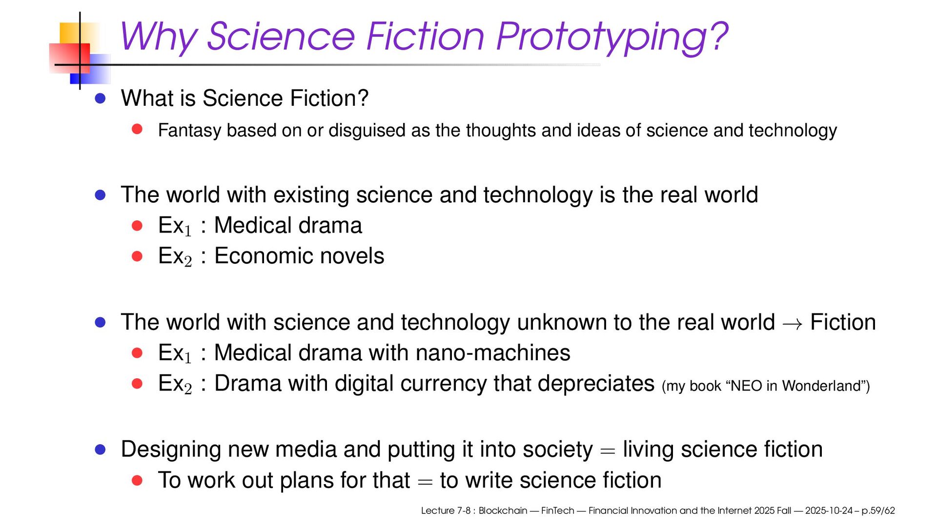 on or disguised as the thoughts and ideas of science and technology The world with existing science and technology is the real world Ex1 : Medical drama Ex2 : Economic novels The world with science and technology unknown to the real world → Fiction Ex1 : Medical drama with nano-machines Ex2 : Drama with digital currency that depreciates (my book “NEO in Wonderland”) Designing new media and putting it into society = living science fiction To work out plans for that = to write science fiction Lecture 7-8 : Blockchain — FinTech — Financial Innovation and the Internet 2025 Fall — 2025-10-24 – p.59/62
