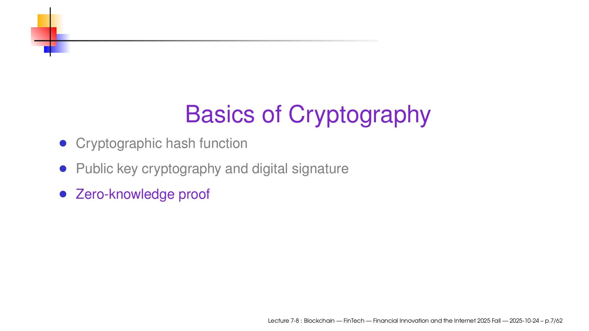 no knowledge other than what prover wants to prove Example: “I know a secret spell to open the door” ↑ Prove this without revealing the spell itself For example, repeat “coming out from the way she is told” for 20 times Completeness Verifier accepts with high probability if the proposition is true Soundness Verifier has little chance of accepting if the proposition is false Zero-knowledge Can imitate dialogue without having to be a prover (without knowledge) Lecture 7-8 : Blockchain — FinTech — Financial Innovation and the Internet 2025 Fall — 2025-10-24 – p.14/62