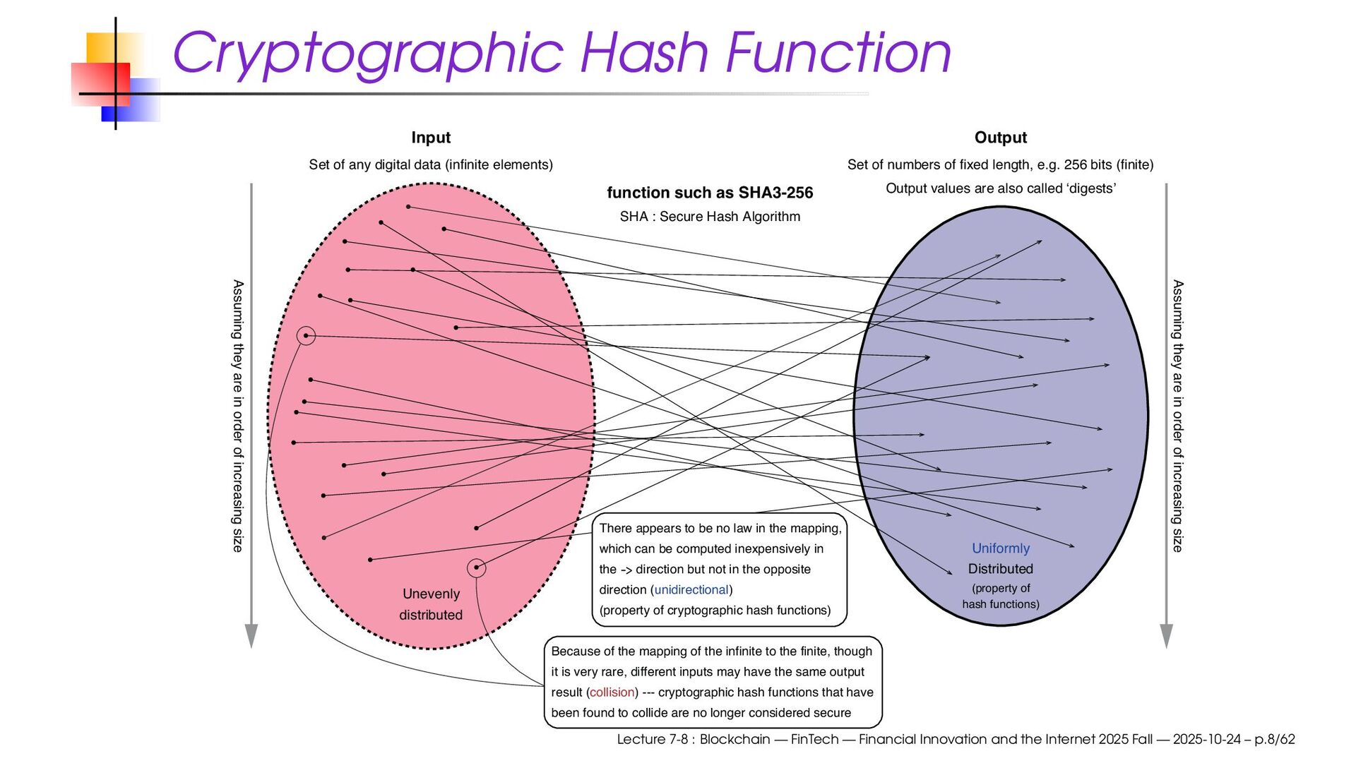 elements) Output Set of numbers of fixed length, e.g. 256 bits (finite) Output values are also called ‘digests’ Assuming they are in order of increasing size Assuming they are in order of increasing size function such as SHA3-256 SHA : Secure Hash Algorithm Uniformly Distributed (property of hash functions) Unevenly distributed There appears to be no law in the mapping, which can be computed inexpensively in the direction but not in the opposite direction (unidirectional) (property of cryptographic hash functions) Because of the mapping of the infinite to the finite, though it is very rare, different inputs may have the same output result (collision) --- cryptographic hash functions that have been found to collide are no longer considered secure Lecture 7-8 : Blockchain — FinTech — Financial Innovation and the Internet 2025 Fall — 2025-10-24 – p.8/62