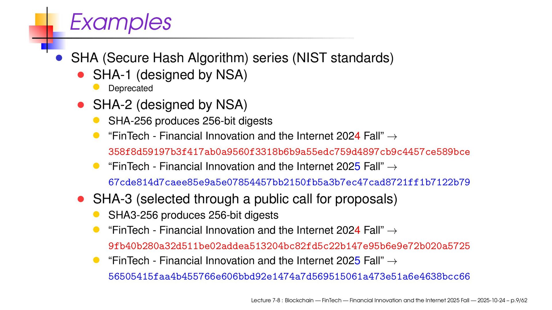 by NSA) Deprecated SHA-2 (designed by NSA) SHA-256 produces 256-bit digests “FinTech - Financial Innovation and the Internet 2024 Fall” → 358f8d59197b3f417ab0a9560f3318b6b9a55edc759d4897cb9c4457ce589bce “FinTech - Financial Innovation and the Internet 2025 Fall” → 67cde814d7caee85e9a5e07854457bb2150fb5a3b7ec47cad8721ff1b7122b79 SHA-3 (selected through a public call for proposals) SHA3-256 produces 256-bit digests “FinTech - Financial Innovation and the Internet 2024 Fall” → 9fb40b280a32d511be02addea513204bc82fd5c22b147e95b6e9e72b020a5725 “FinTech - Financial Innovation and the Internet 2025 Fall” → 56505415faa4b455766e606bbd92e1474a7d569515061a473e51a6e4638bcc66 Lecture 7-8 : Blockchain — FinTech — Financial Innovation and the Internet 2025 Fall — 2025-10-24 – p.9/62