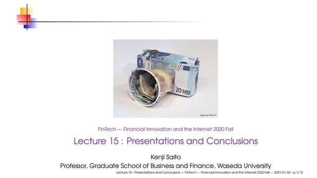 Lecture 15 : Presentations and Conclusions Kenji Saito Professor, Graduate School of Business and Finance, Waseda University Lecture 15 : Presentations and Conclusions — FinTech — Financial Innovation and the Internet 2020 Fall — 2021-01-22 – p.1/12