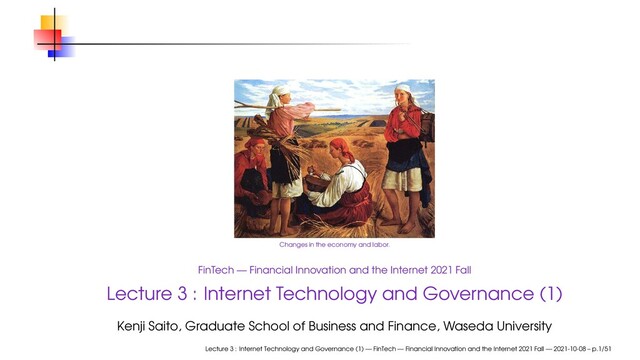 and the Internet 2021 Fall Lecture 3 : Internet Technology and Governance (1) Kenji Saito, Graduate School of Business and Finance, Waseda University Lecture 3 : Internet Technology and Governance (1) — FinTech — Financial Innovation and the Internet 2021 Fall — 2021-10-08 – p.1/51