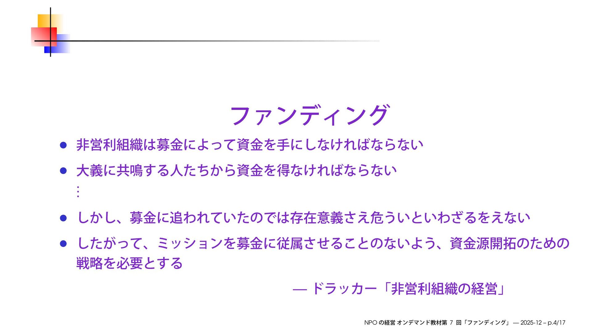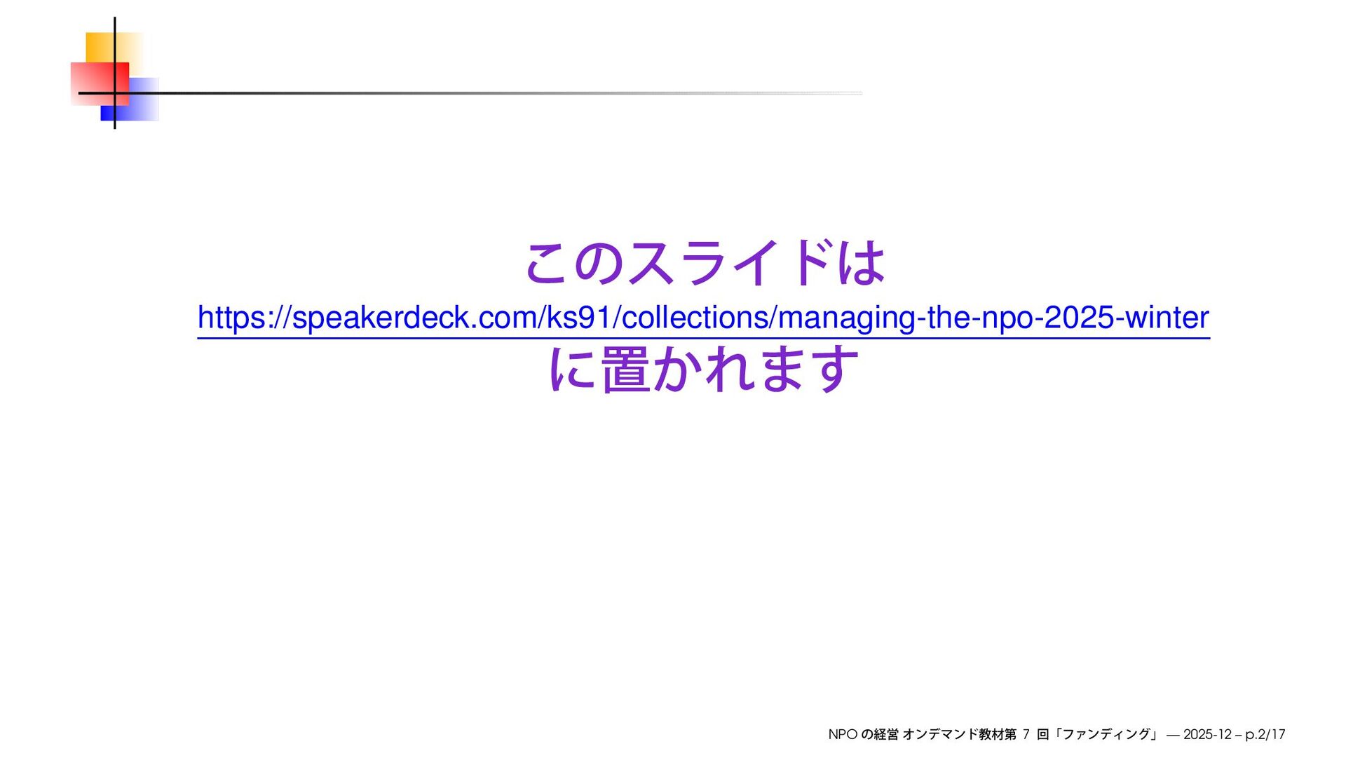 https://speakerdeck.com/ks91/collections/managing-the-npo-2025-winter NPO 7 — 2025-12 – p.2/17