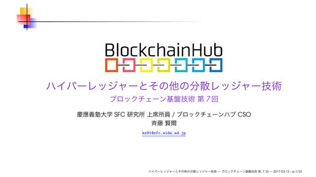 ブロックチェーンハブ主催で開催している連続講義 (通算第3期) ブロックチェーン基盤技術 第7回「ハイパーレッジャーとその他の分散レッジャー技術」のスライドです。2017年3月15日(水) に使用しました。