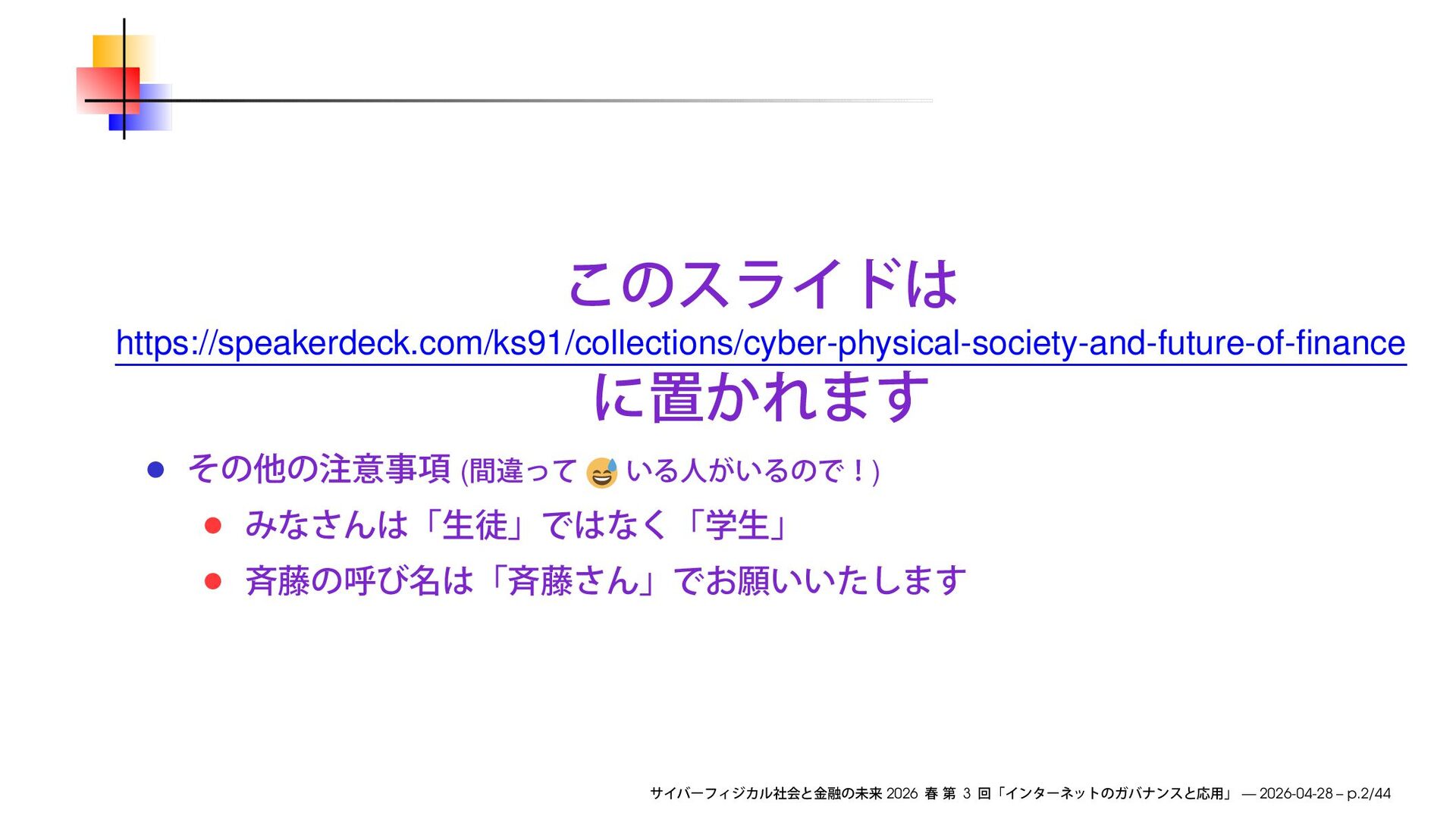 https://speakerdeck.com/ks91/collections/cyber-physical-society-and-future-of-finance ( ) 2026 3 — 2026-04-28 – p.2/44