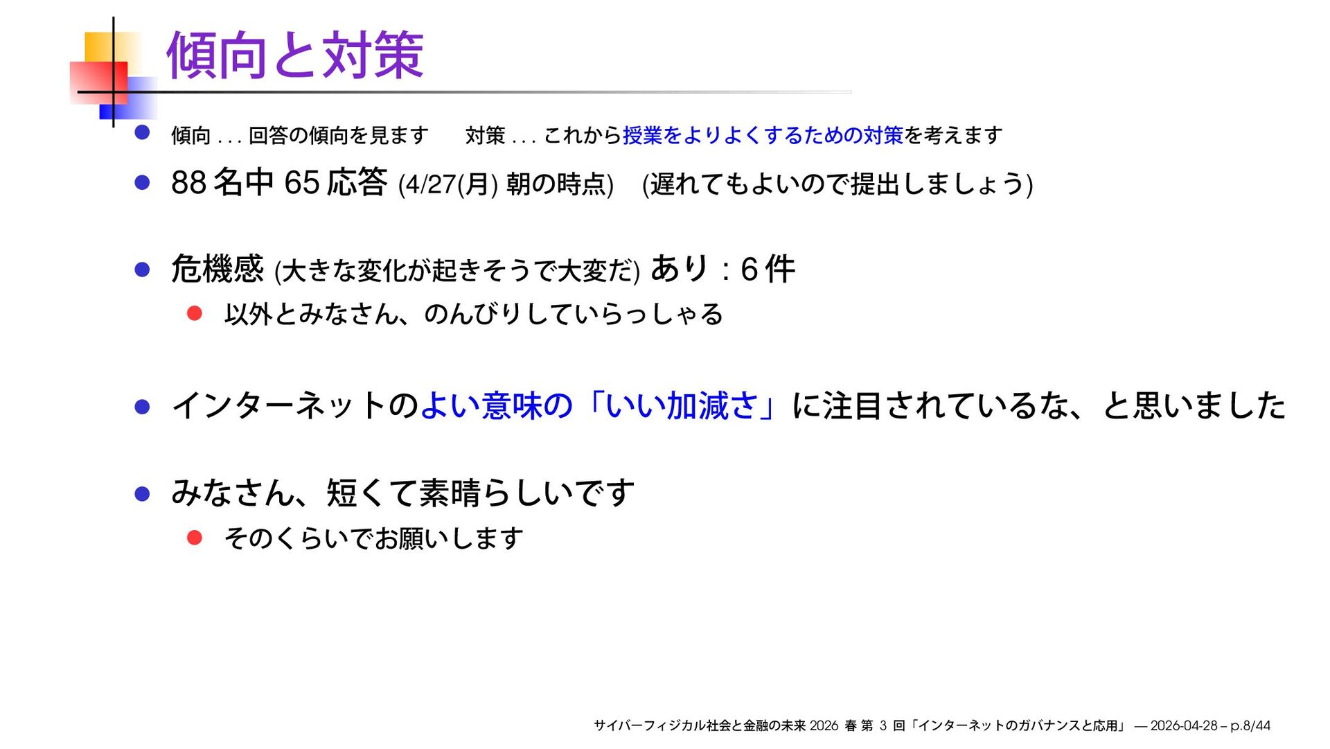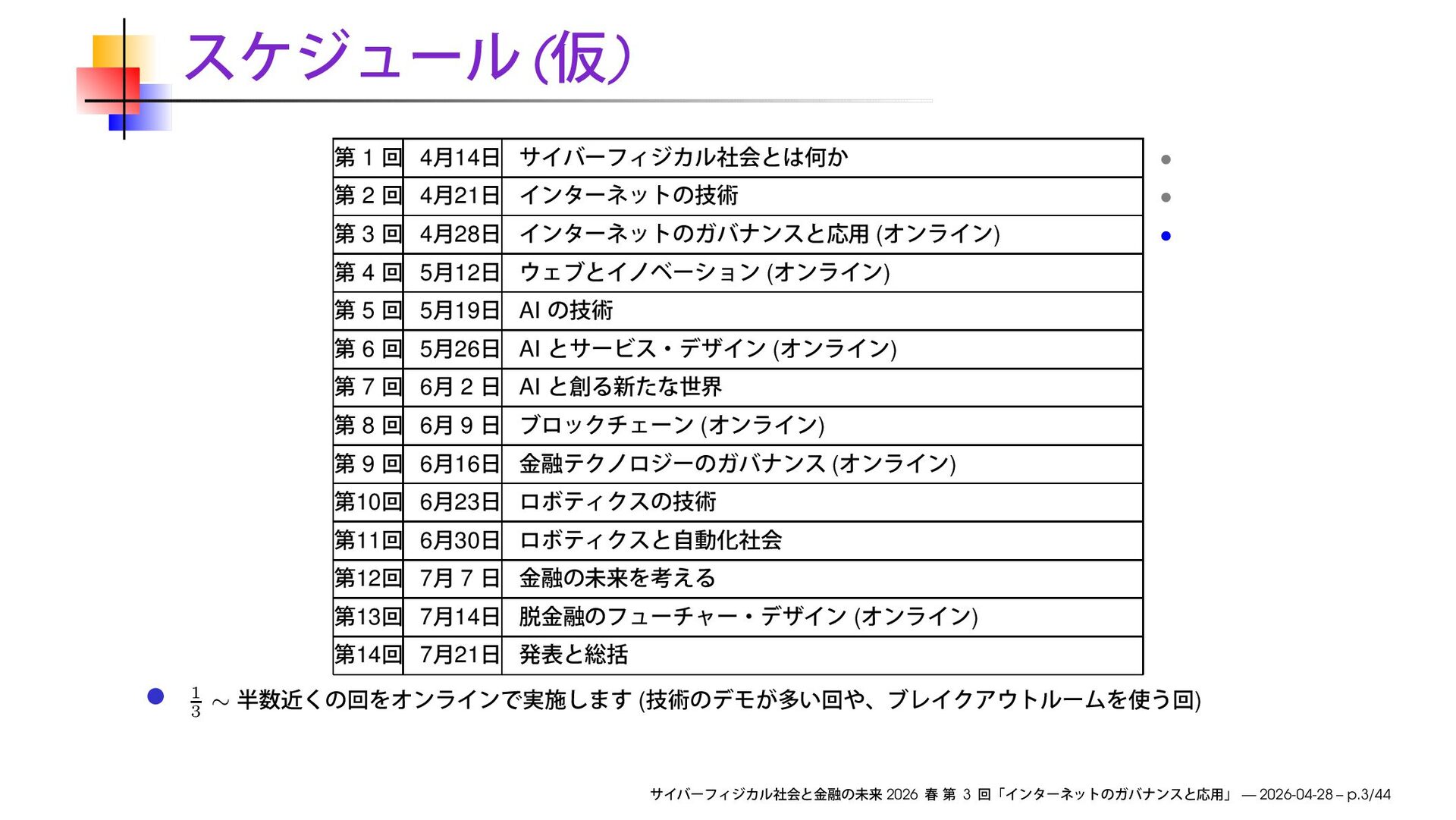 3 4 28 ( ) • 4 5 12 ( ) 5 5 19 AI 6 5 26 AI ( ) 7 6 2 AI 8 6 9 ( ) 9 6 16 ( ) 10 6 23 11 6 30 12 7 7 13 7 14 ( ) 14 7 21 1 3 ∼ ( ) 2026 3 — 2026-04-28 – p.3/44