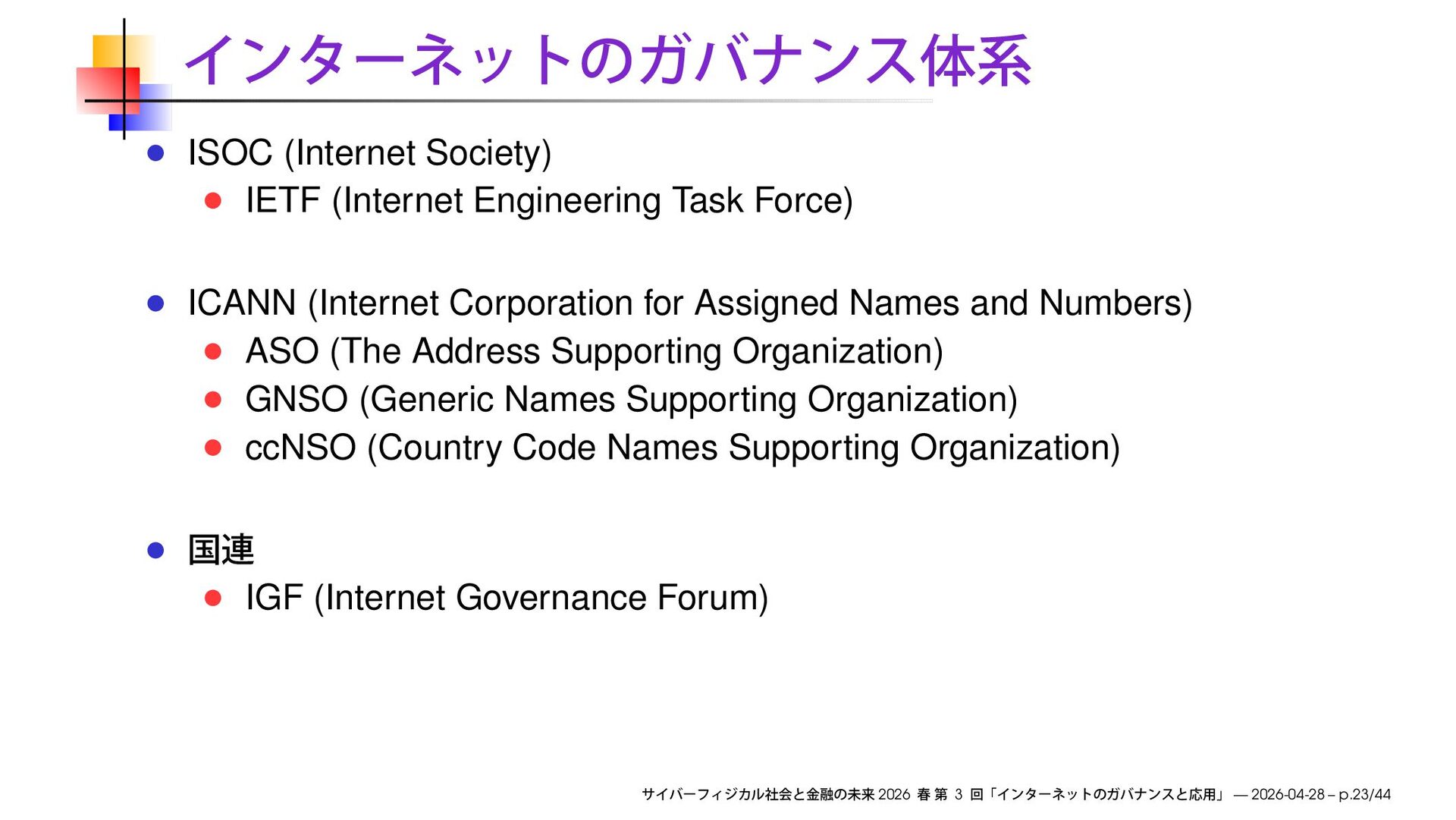 Corporation for Assigned Names and Numbers) ASO (The Address Supporting Organization) GNSO (Generic Names Supporting Organization) ccNSO (Country Code Names Supporting Organization) IGF (Internet Governance Forum) 2026 3 — 2026-04-28 – p.23/44