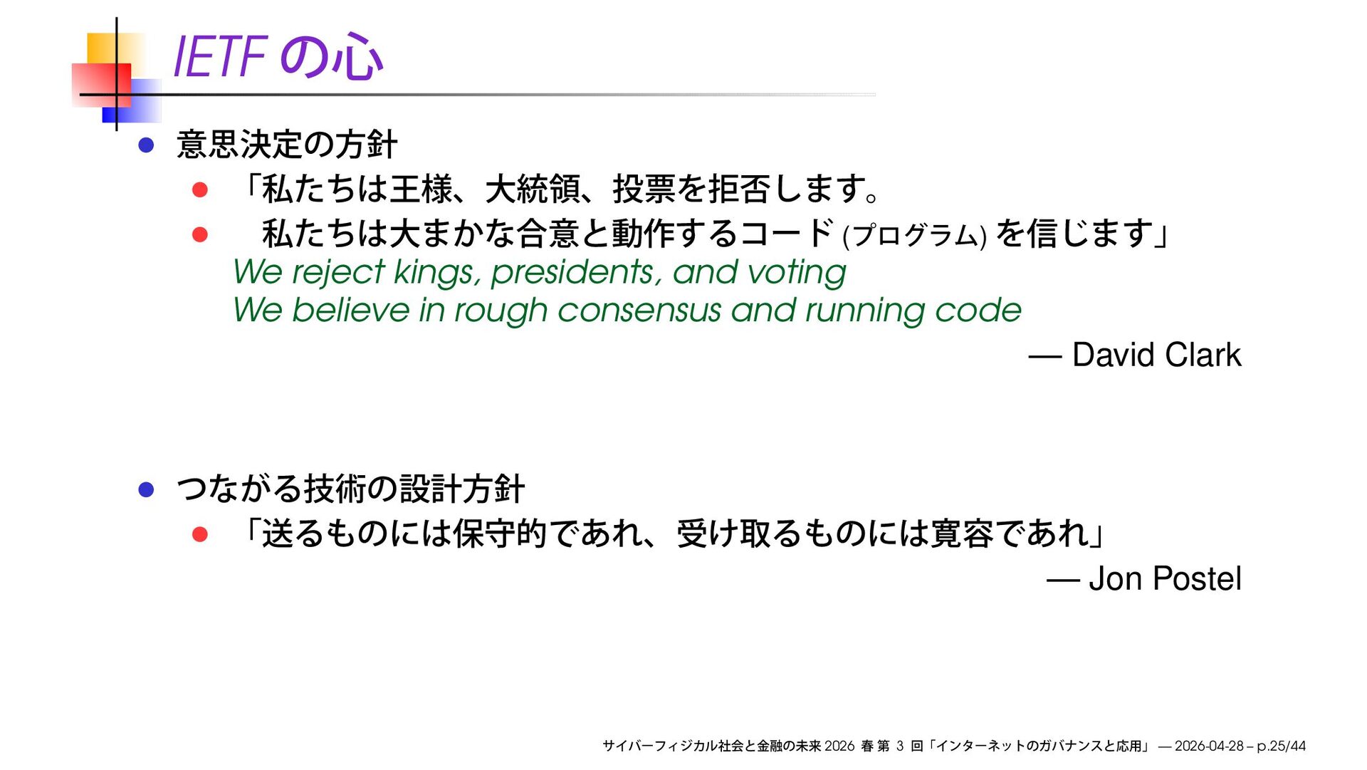 believe in rough consensus and running code — David Clark — Jon Postel 2026 3 — 2026-04-28 – p.25/44