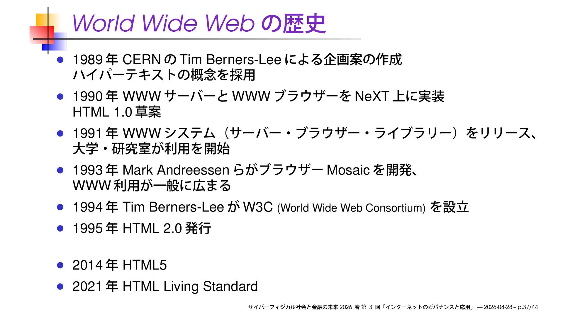 NeXT HTML 1.0 1991 WWW 1993 Mark Andreessen Mosaic WWW 1994 Tim Berners-Lee W3C (World Wide Web Consortium) 1995 HTML 2.0 2014 HTML5 2021 HTML Living Standard 2026 3 — 2026-04-28 – p.37/44