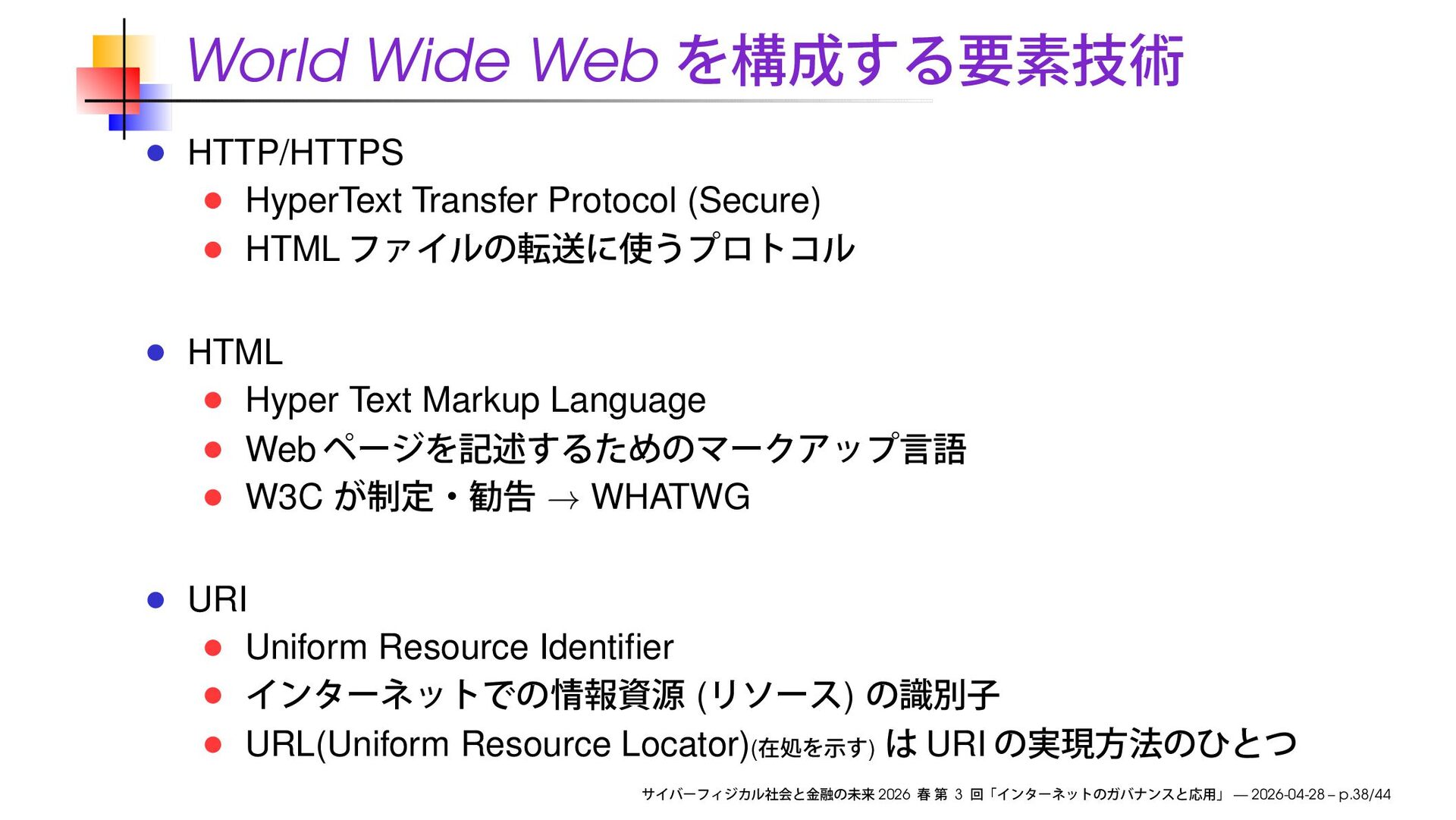 Hyper Text Markup Language Web W3C → WHATWG URI Uniform Resource Identifier ( ) URL(Uniform Resource Locator)( ) URI 2026 3 — 2026-04-28 – p.38/44