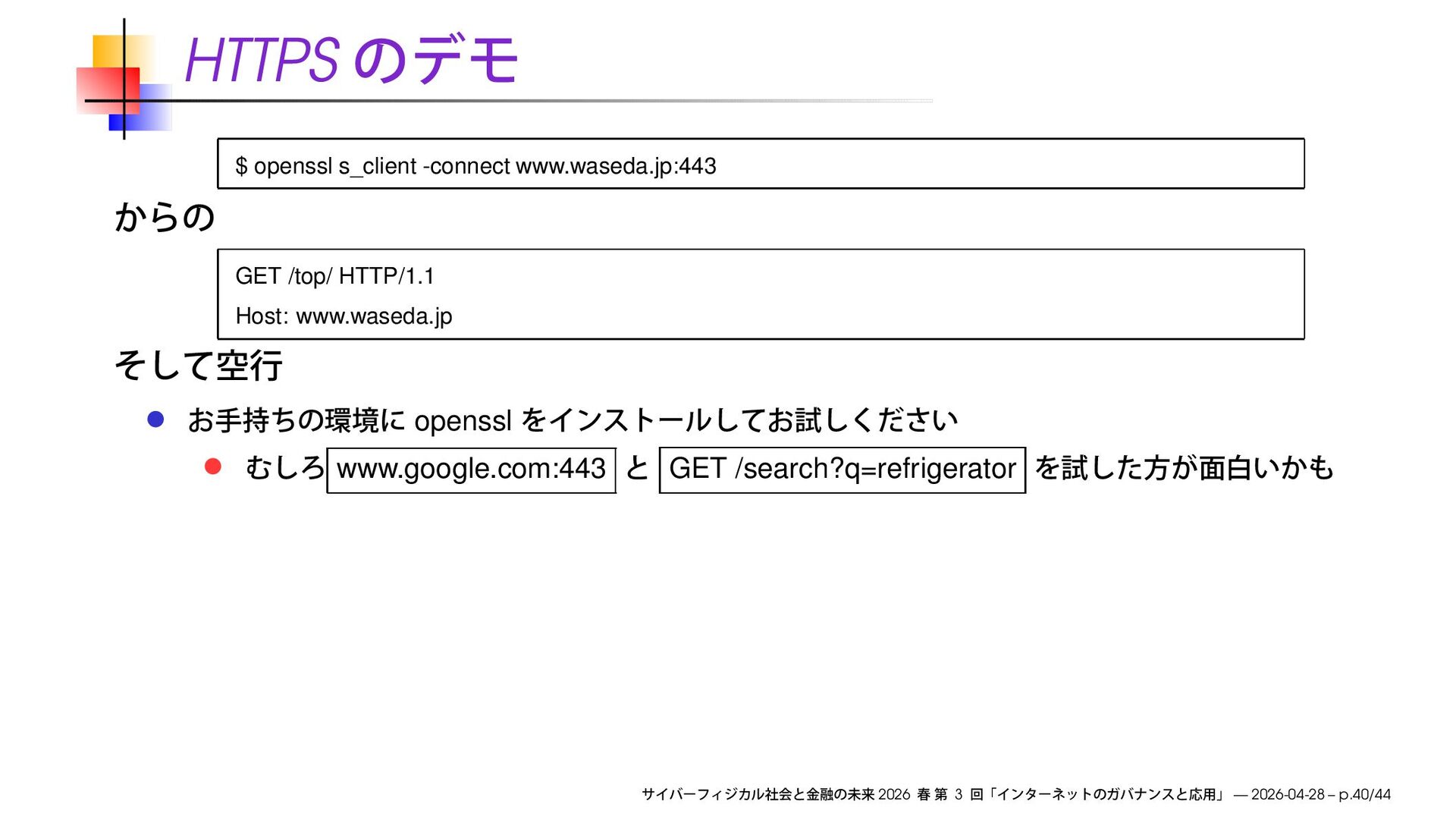 www.waseda.jp openssl www.google.com:443 GET /search?q=refrigerator 2026 3 — 2026-04-28 – p.40/44