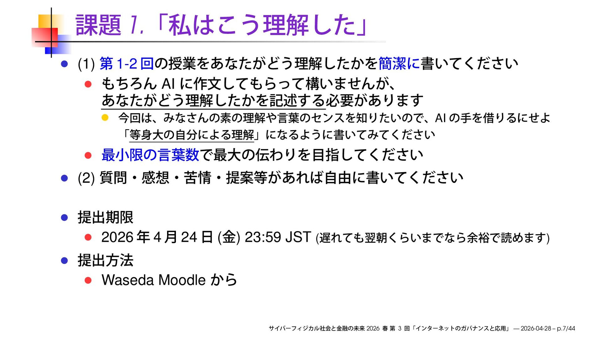 ) 23:59 JST ( ) Waseda Moodle 2026 3 — 2026-04-28 – p.7/44