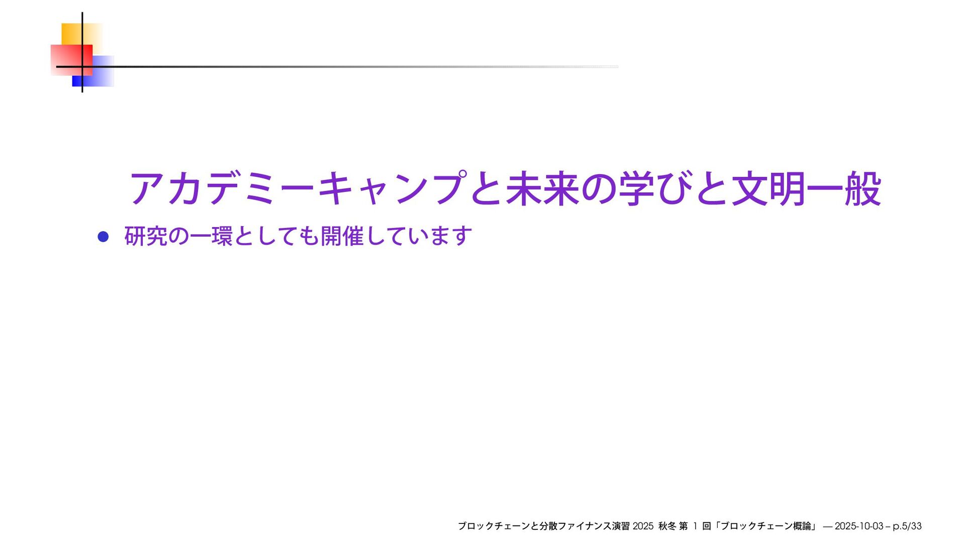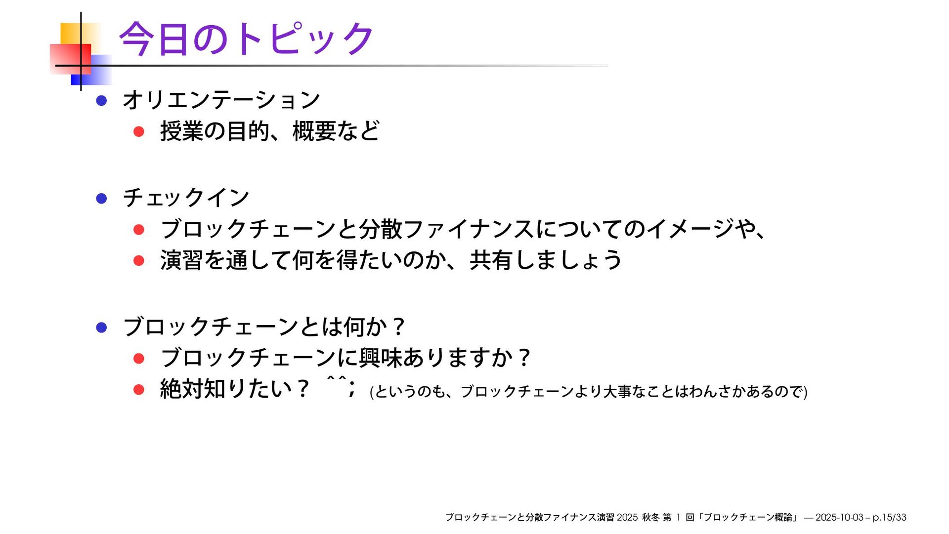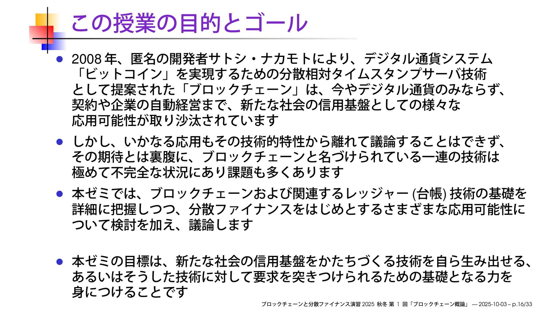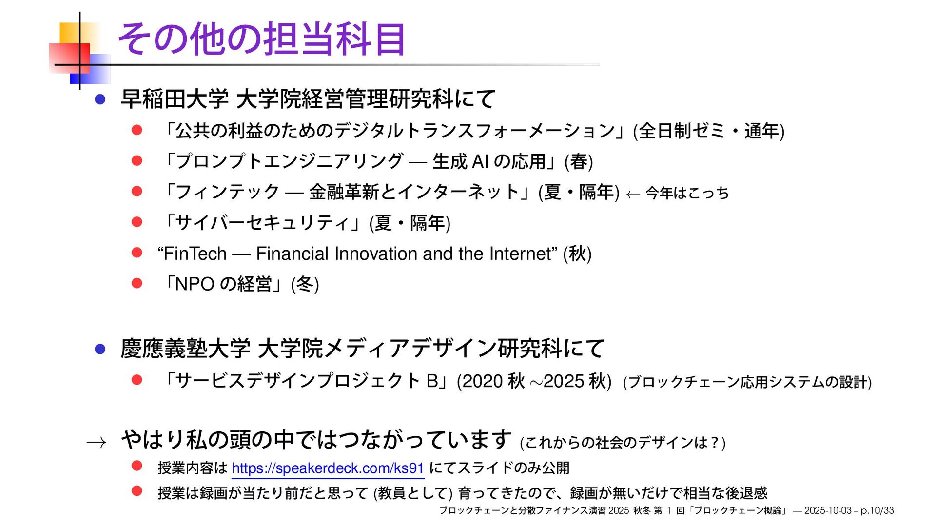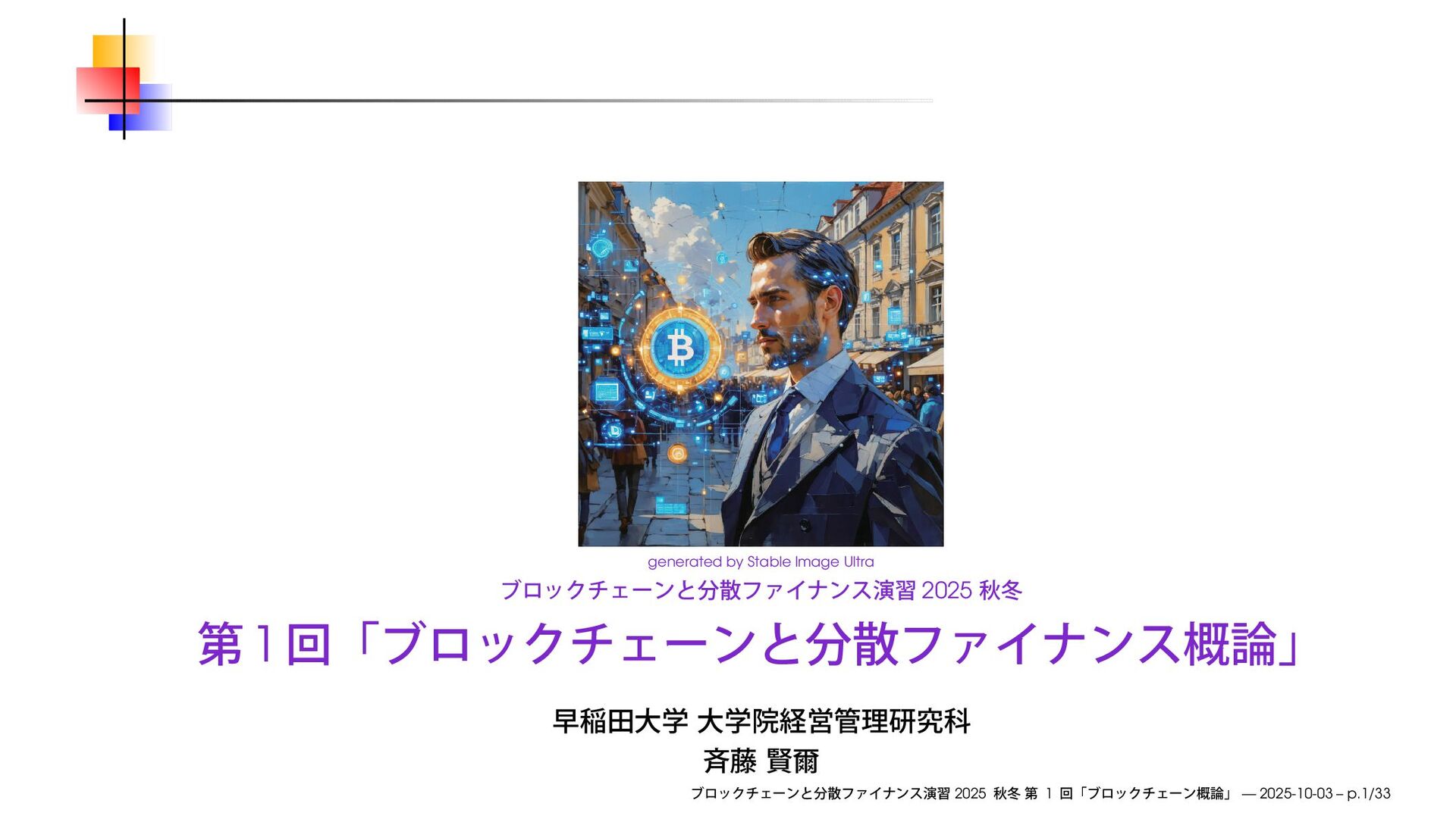 早稲田大学大学院経営管理研究科「ブロックチェーンと分散ファイナンス演習」2025 秋の第1回で使用したスライドです。