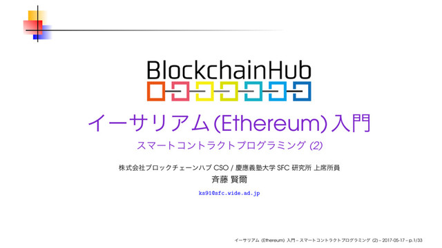 ブロックチェーンハブ主催で開催している (第2期) スマートコントラクトプログラミング講義 (2) 「イーサリアム (Ethereum) 入門」のスライドです。2017年5月17日(水) に使用しました。