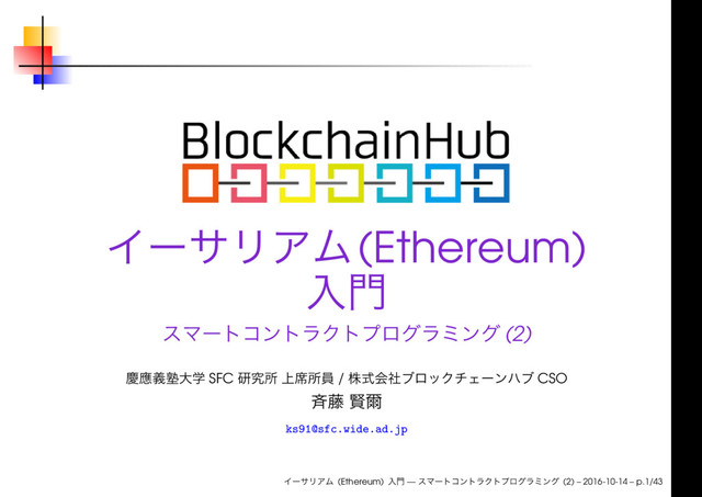 ブロックチェーンハブ主催で開催しているブロックチェーン連続講義シリーズ「スマートコントラクトプログラミング」の第2回「イーサリアム(Ethereum)入門」のスライドです。2016年10月14日(金) に使用しました。