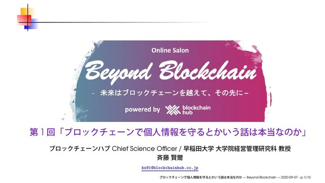 2020年9月7日(月)、オンラインサロン Beyond Blockchain 第1回「ブロックチェーンで個人情報を守るとかいう話は本当なのか」にて使用したスライドです。