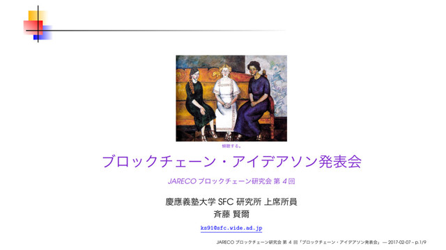 JARECO (日米不動産協力機構) にて開催されているブロックチェーン研究会の第4回(ブロックチェーン・アイデアソンの発表会)で用いたスライドです。2017年2月7日(火)に使用しました。