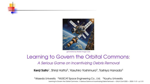 Commons: A Serious Game on Incentivizing Debris Removal Kenji Saito1, Shinji Hatta2, Yasuhiro Yoshimura3, Toshiya Hanada3 1Waseda University 2MUSCAT Space Engineering Co., Ltd. 3Kyushu University Learning to Govern the Orbital Commons : A Serious Game on Incentivizing Debris Removal — GALA Conf 2025 — 2025-11-21 – p.1/13