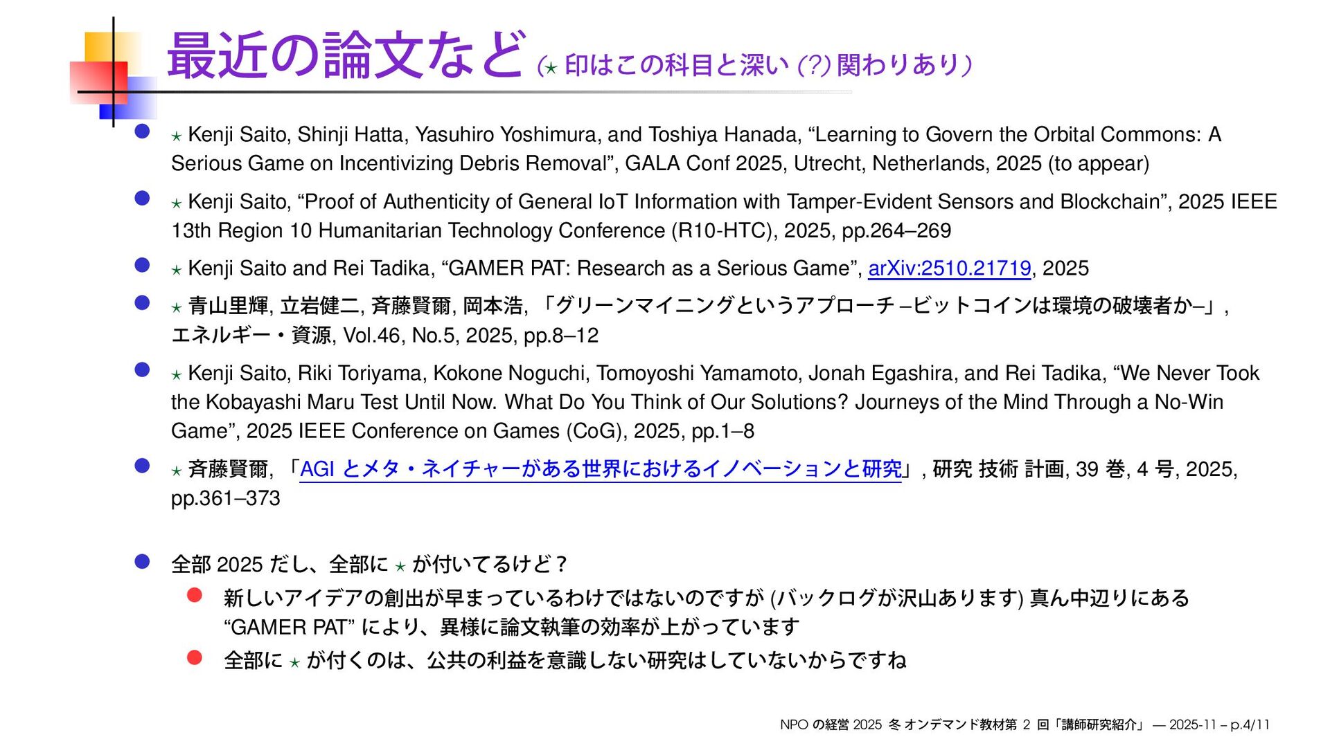 and Toshiya Hanada, “Learning to Govern the Orbital Commons: A Serious Game on Incentivizing Debris Removal”, GALA Conf 2025, Utrecht, Netherlands, 2025 (to appear) ⋆ Kenji Saito, “Proof of Authenticity of General IoT Information with Tamper-Evident Sensors and Blockchain”, 2025 IEEE 13th Region 10 Humanitarian Technology Conference (R10-HTC), 2025, pp.264–269 ⋆ Kenji Saito and Rei Tadika, “GAMER PAT: Research as a Serious Game”, arXiv:2510.21719, 2025 ⋆ , , , , – – , , Vol.46, No.5, 2025, pp.8–12 ⋆ Kenji Saito, Riki Toriyama, Kokone Noguchi, Tomoyoshi Yamamoto, Jonah Egashira, and Rei Tadika, “We Never Took the Kobayashi Maru Test Until Now. What Do You Think of Our Solutions? Journeys of the Mind Through a No-Win Game”, 2025 IEEE Conference on Games (CoG), 2025, pp.1–8 ⋆ , AGI , , 39 , 4 , 2025, pp.361–373 2025 ⋆ ( ) “GAMER PAT” ⋆ NPO 2025 2 — 2025-11 – p.4/11