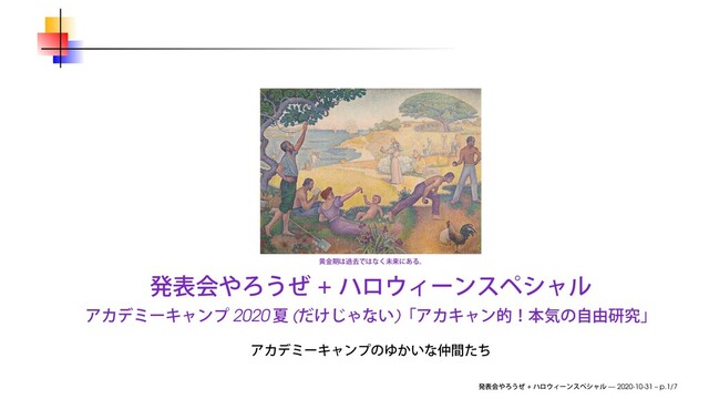2020年10月31日(土)、オンラインで行われたアカデミーキャンプ 2020夏(だけじゃない)「アカキャン的!本気の自由研究」第13回にて使用したスライドです。