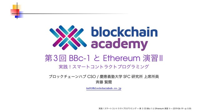 2019年6月19日(水)、ブロックチェーンハブ主催で開催されたブロックチェーンアカデミー「実践!スマートコントラクトプログラミング 第3回 BBc-1 と Ethereum 演習 II」にて使用したスライドです。