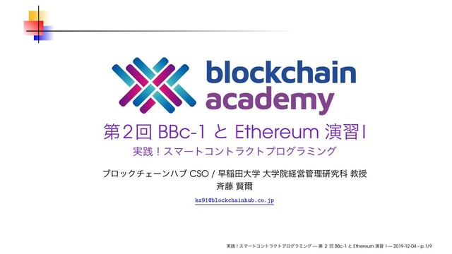 2019年12月4日(水)、ブロックチェーンハブ主催で開催されたブロックチェーンアカデミー「実践!スマートコントラクトプログラミング 第2回 BBc-1 と Ethereum 演習 I」にて使用したスライドです。