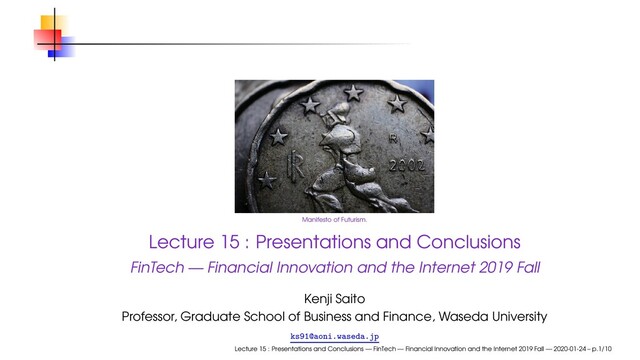 — Financial Innovation and the Internet 2019 Fall Kenji Saito Professor, Graduate School of Business and Finance, Waseda University [email protected] Lecture 15 : Presentations and Conclusions — FinTech — Financial Innovation and the Internet 2019 Fall — 2020-01-24 – p.1/10