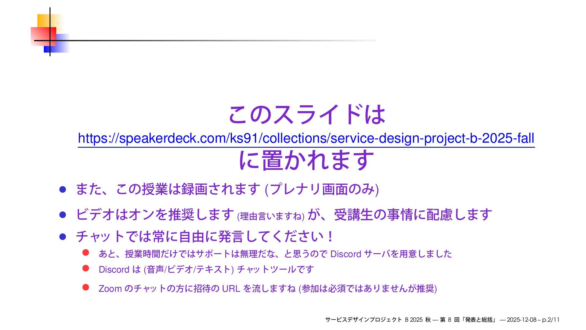 https://speakerdeck.com/ks91/collections/service-design-project-b-2025-fall ( ) ( ) Discord Discord ( / /