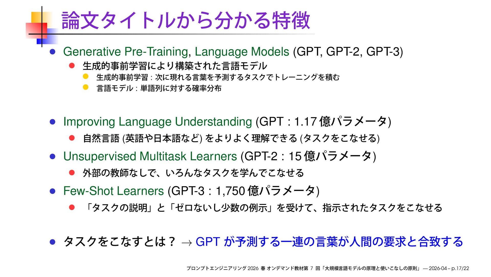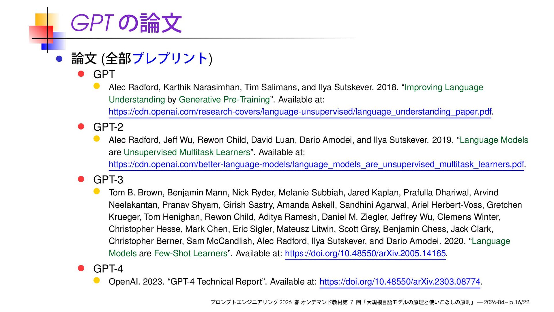 and Ilya Sutskever. 2018. “Improving Language Understanding by Generative Pre-Training”. Available at: https://cdn.openai.com/research-covers/language-unsupervised/language_understanding_paper.pdf. GPT-2 Alec Radford, Jeff Wu, Rewon Child, David Luan, Dario Amodei, and Ilya Sutskever. 2019. “Language Models are Unsupervised Multitask Learners”. Available at: https://cdn.openai.com/better-language-models/language_models_are_unsupervised_multitask_learners.pdf. GPT-3 Tom B. Brown, Benjamin Mann, Nick Ryder, Melanie Subbiah, Jared Kaplan, Prafulla Dhariwal, Arvind Neelakantan, Pranav Shyam, Girish Sastry, Amanda Askell, Sandhini Agarwal, Ariel Herbert-Voss, Gretchen Krueger, Tom Henighan, Rewon Child, Aditya Ramesh, Daniel M. Ziegler, Jeffrey Wu, Clemens Winter, Christopher Hesse, Mark Chen, Eric Sigler, Mateusz Litwin, Scott Gray, Benjamin Chess, Jack Clark, Christopher Berner, Sam McCandlish, Alec Radford, Ilya Sutskever, and Dario Amodei. 2020. “Language Models are Few-Shot Learners”. Available at: https://doi.org/10.48550/arXiv.2005.14165. GPT-4 OpenAI. 2023. “GPT-4 Technical Report”. Available at: https://doi.org/10.48550/arXiv.2303.08774. 2026 7 — 2026-04 – p.14/22