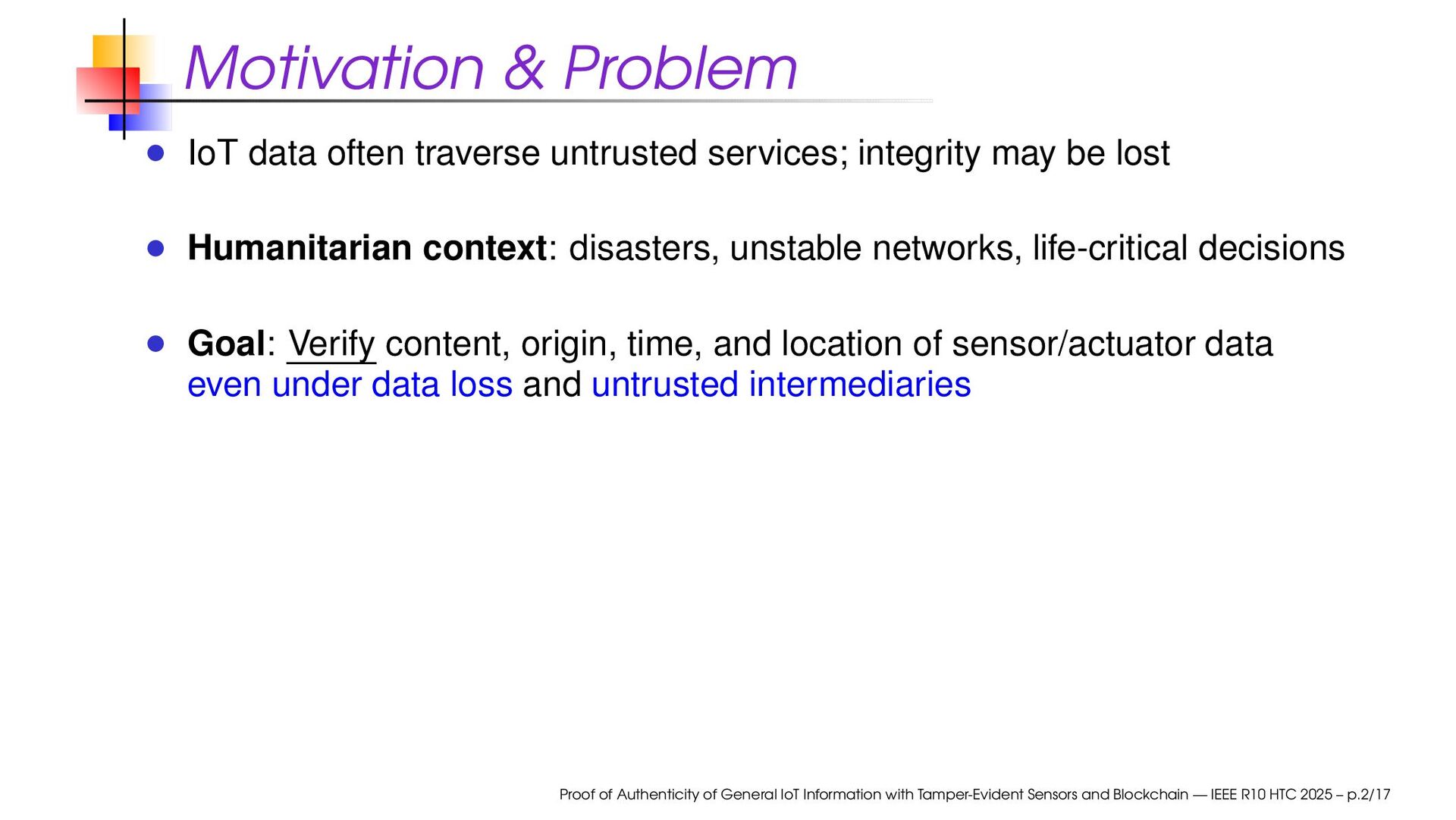 may be lost Humanitarian context: disasters, unstable networks, life-critical decisions Goal: Verify content, origin, time, and location of sensor/actuator data even under data loss and untrusted intermediaries Proof of Authenticity of General IoT Information with Tamper-Evident Sensors and Blockchain — IEEE R10 HTC 2025 – p.2/17