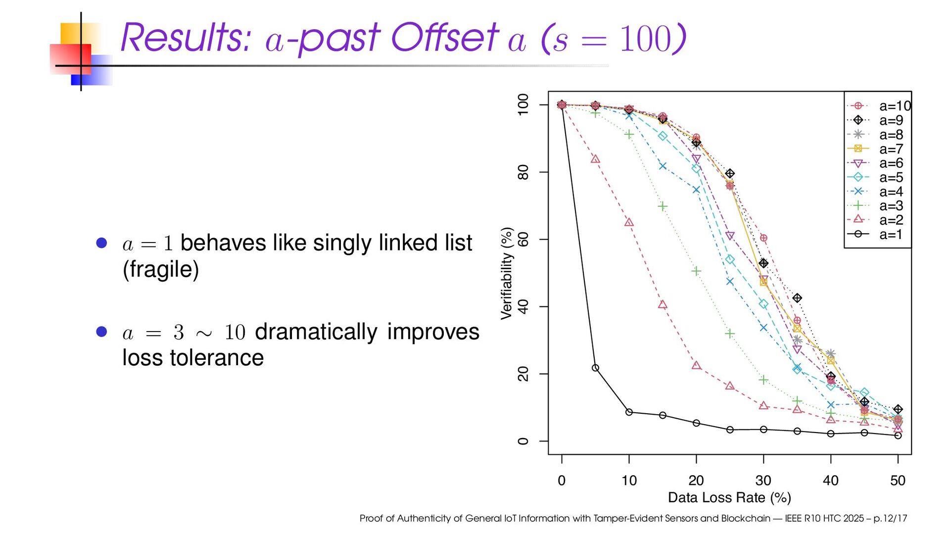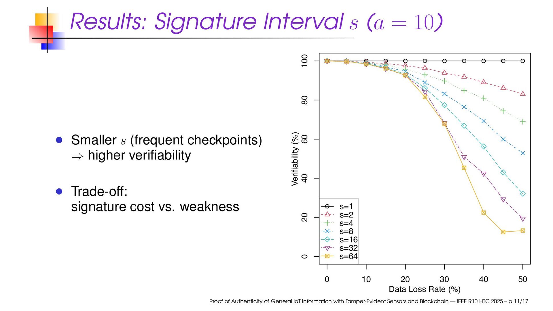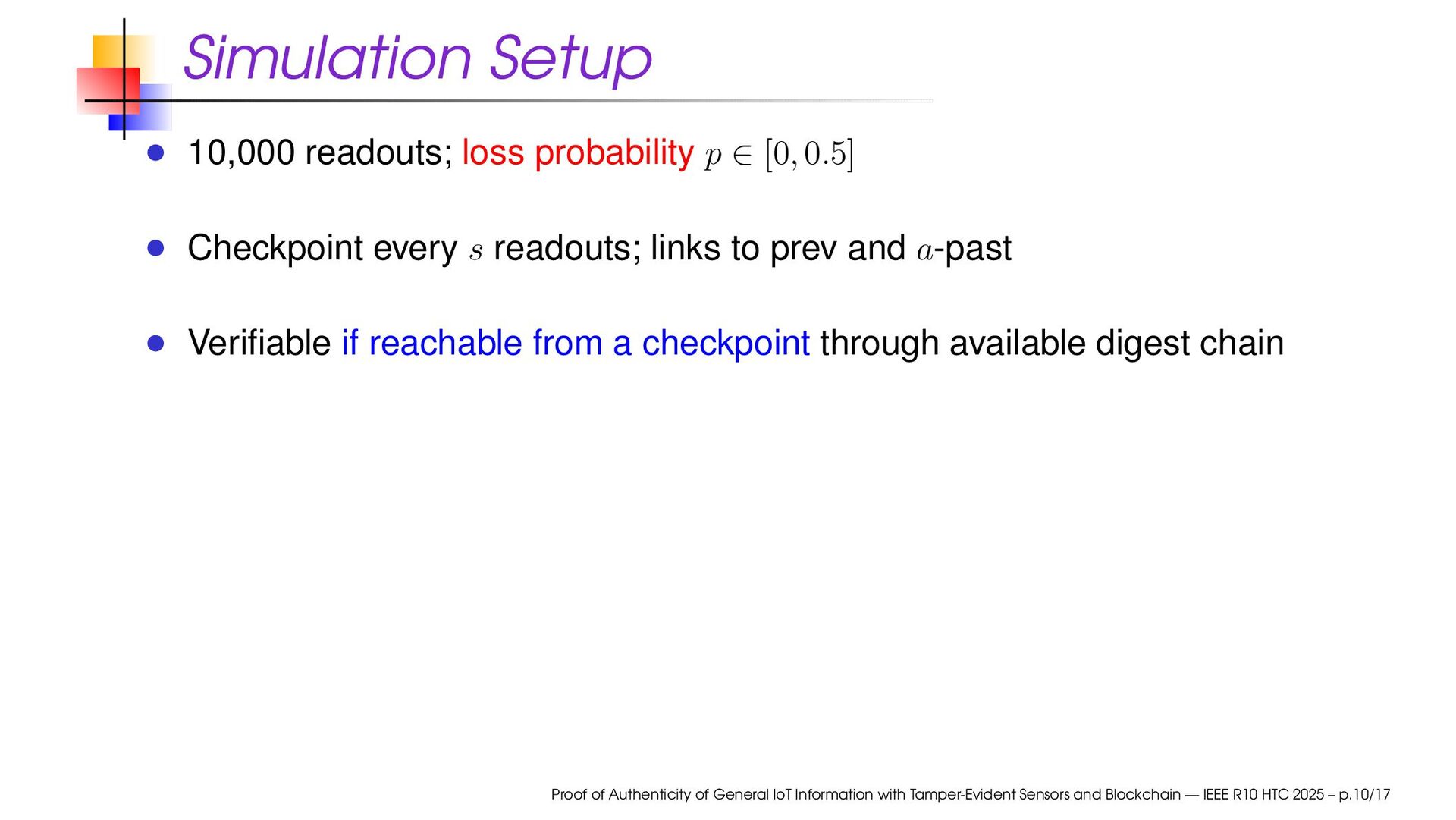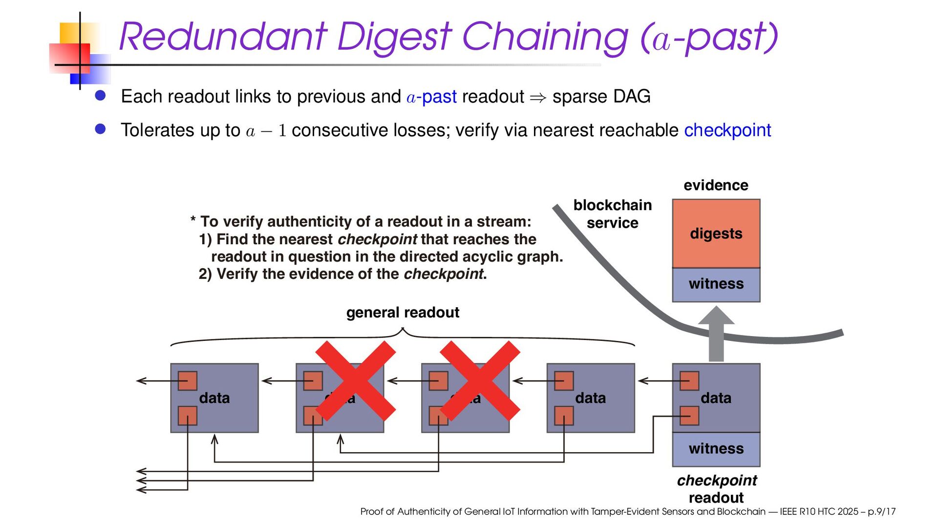 Checkpoint every s readouts; links to prev and a-past Verifiable if reachable from a checkpoint through available digest chain Proof of Authenticity of General IoT Information with Tamper-Evident Sensors and Blockchain — IEEE R10 HTC 2025 – p.10/17