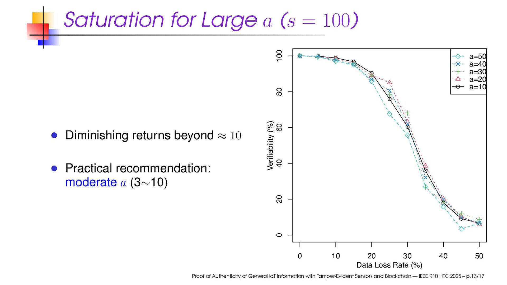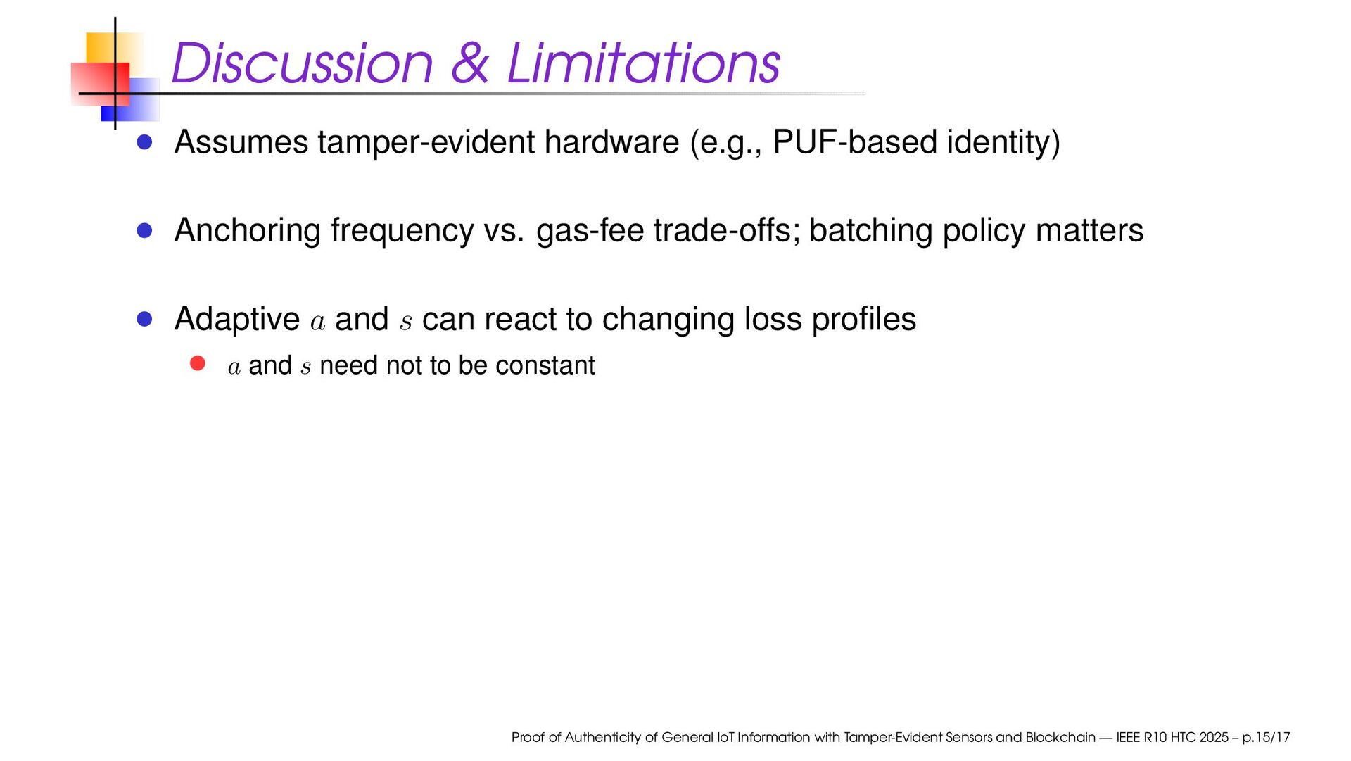frequency vs. gas-fee trade-offs; batching policy matters Adaptive a and s can react to changing loss profiles a and s need not to be constant Proof of Authenticity of General IoT Information with Tamper-Evident Sensors and Blockchain — IEEE R10 HTC 2025 – p.15/17