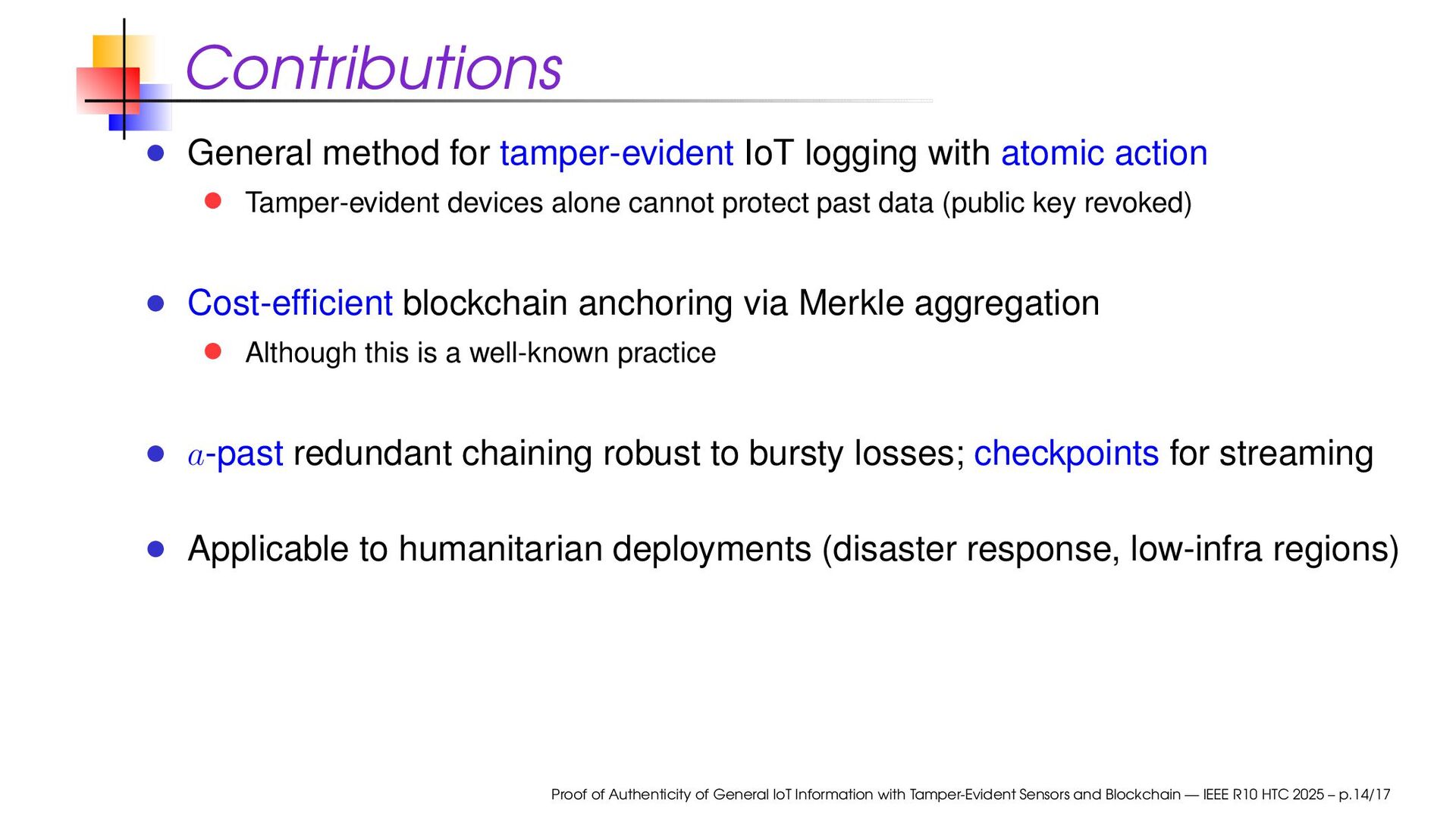 Tamper-evident devices alone cannot protect past data (public key revoked) Cost-efficient blockchain anchoring via Merkle aggregation Although this is a well-known practice a-past redundant chaining robust to bursty losses; checkpoints for streaming Applicable to humanitarian deployments (disaster response, low-infra regions) Proof of Authenticity of General IoT Information with Tamper-Evident Sensors and Blockchain — IEEE R10 HTC 2025 – p.14/17
